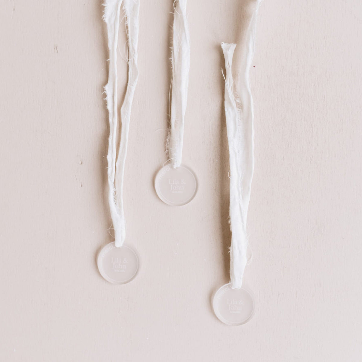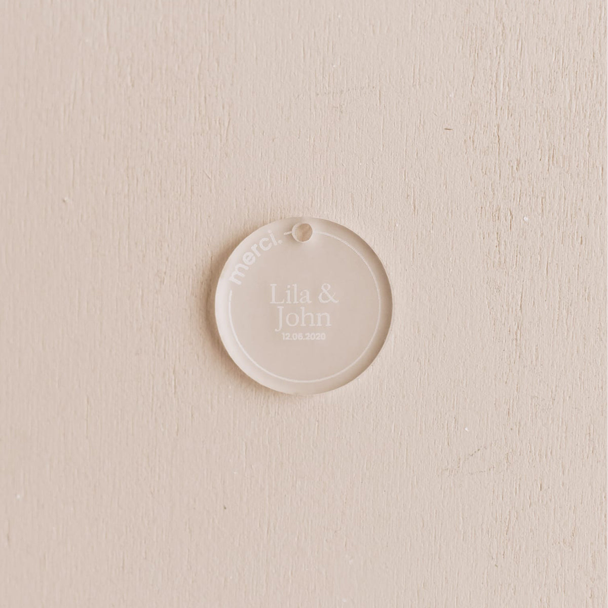 Découvrez nos jolies étiquettes personnalisées Dot. Imaginées par Les Mignonneries, en plexi givré, et à personnaliser avec vos initiales, elles vous permettront de remercier vos invités en ornant joliment leurs cadeaux.