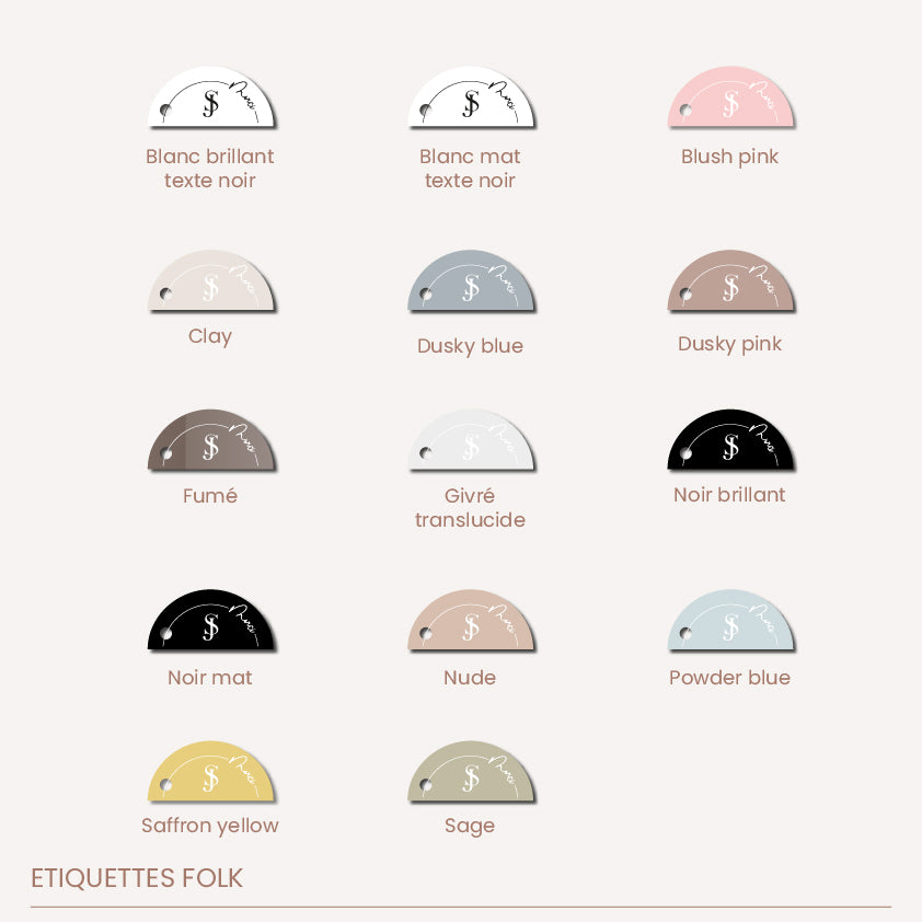 Ces étiquettes sont en plexi fumé, elles sont découpées et imprimées dans notre atelier. Ce produit fait partie de notre collection Folk.