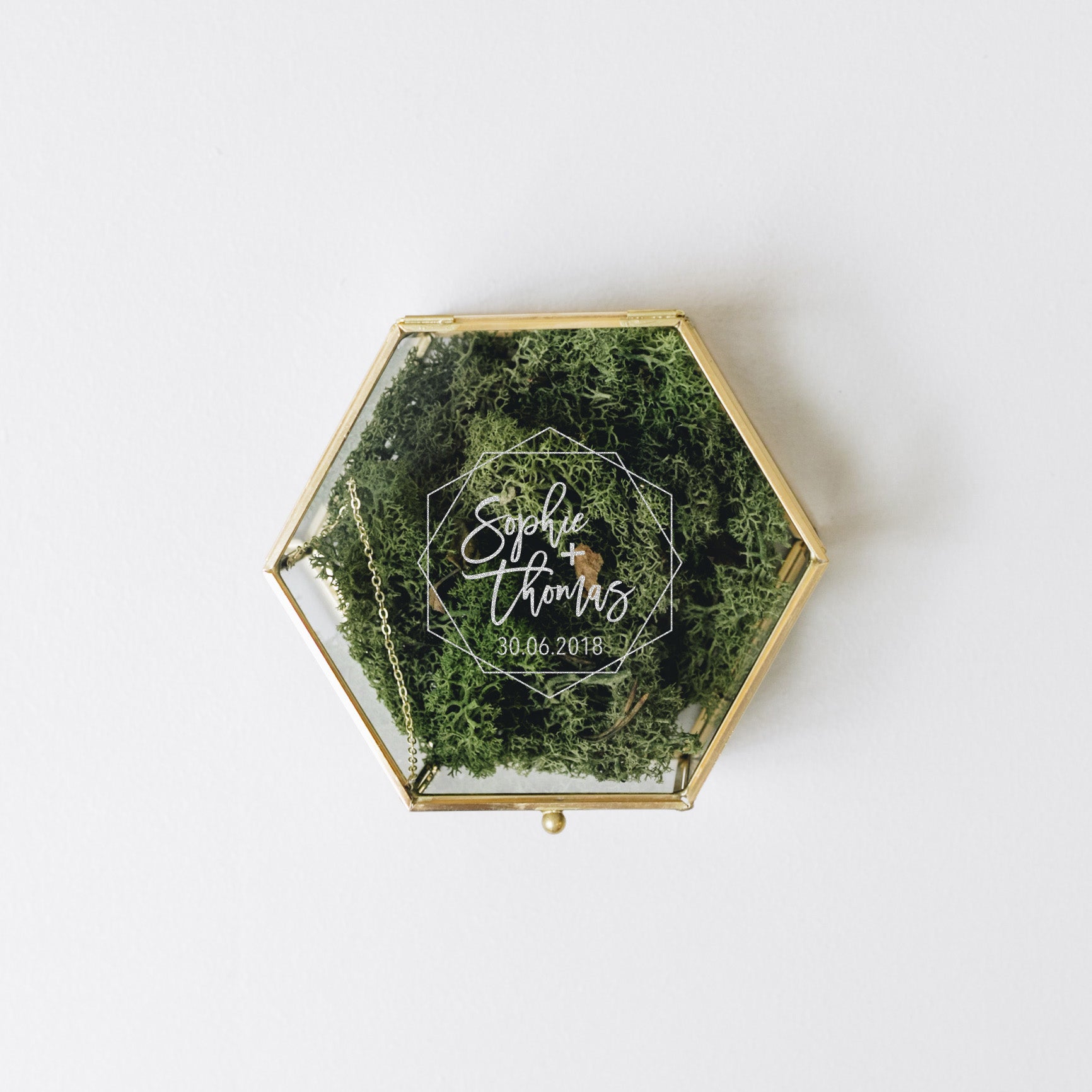 Découvrez la boîte pour alliances hexagonale personnalisée Plexi. Une boîte à alliances de mariage imaginée par Les Mignonneries à personnaliser avec vos prénoms, ou la date de votre mariage.