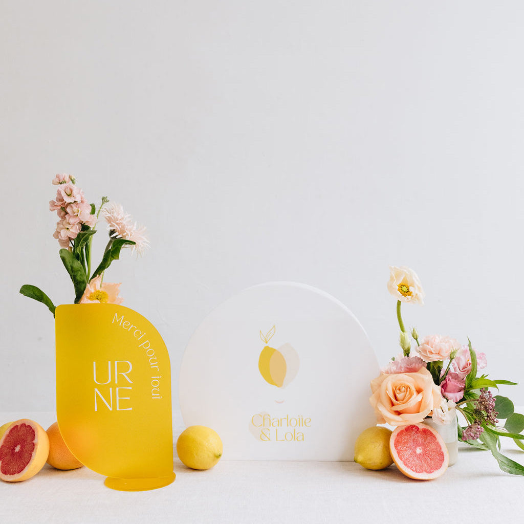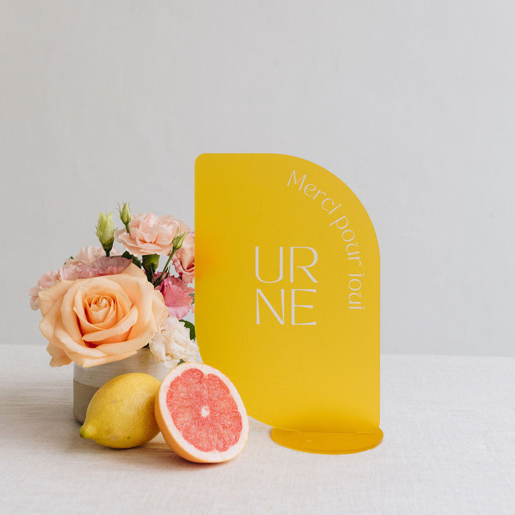 Découvrez notre panneau "urne" Dolce en plexi givré saffran yellow et texte blanc. Imaginé par Les Mignonneries, il est découpé et imprimé dans notre atelier.