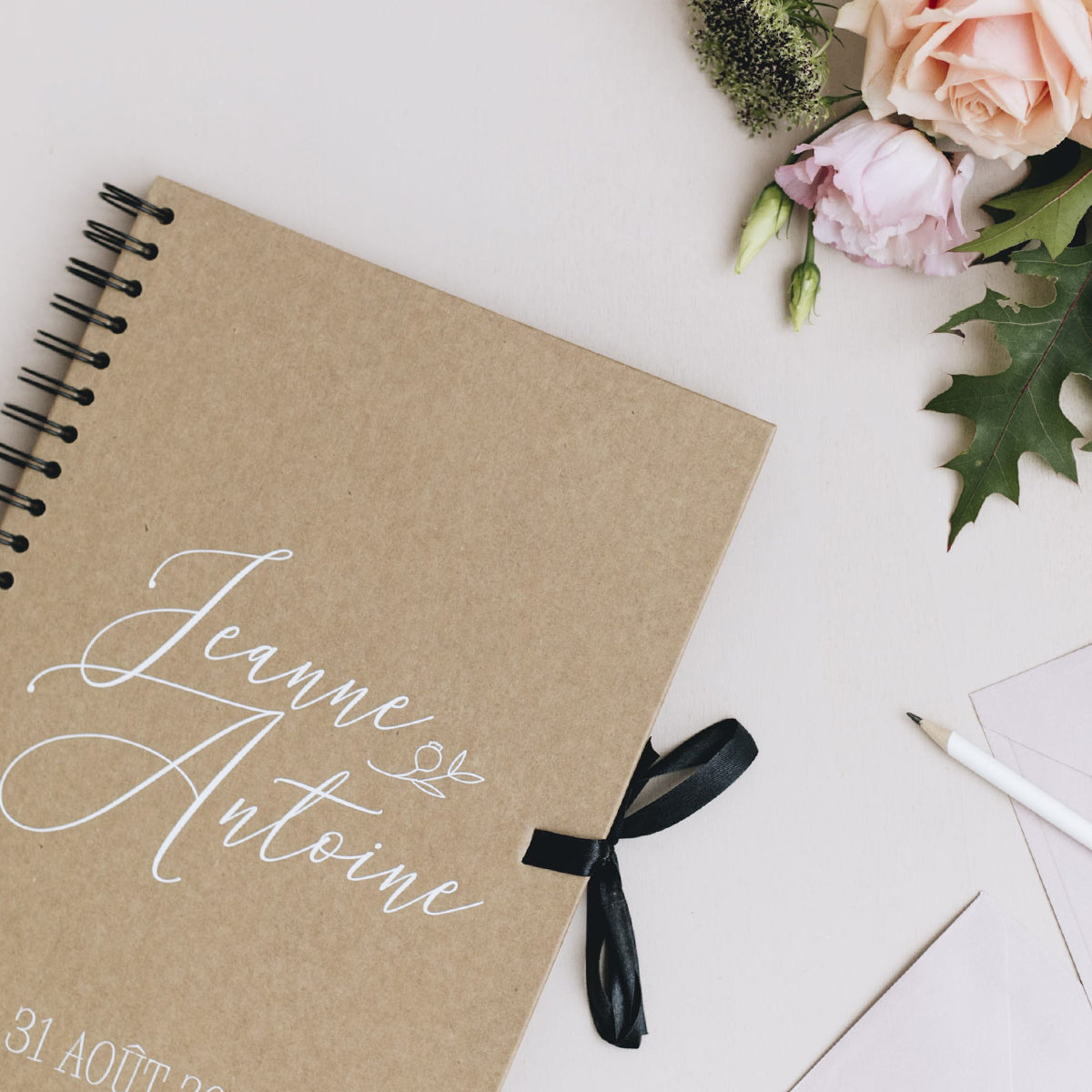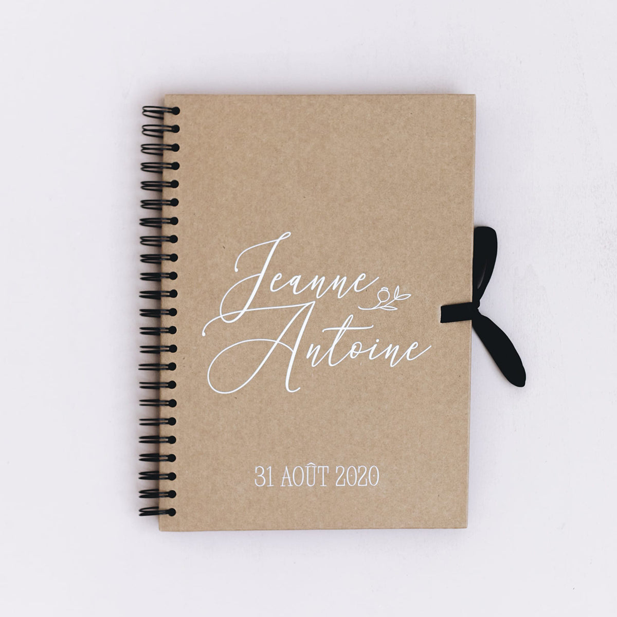 Celui de la collection "Aurélia" à la couverture kraft, l'écriture blanche et le ruban noir, personnalisé dans nos ateliers, vous séduira pour sa simplicité tout en détails. Vous pourrez personnaliser vos prénoms et la date de votre événement sur la page de couverture.