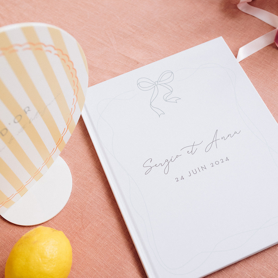 Celui de la collection "Napoli" à la couverture rigide blanche, et au texte coloré, imprimé dans notre atelier, vous séduira par son originalité et son parfum d'Italie. Vous pourrez personnaliser vos prénoms et la date de votre événement sur la page de couverture.
