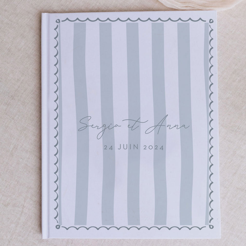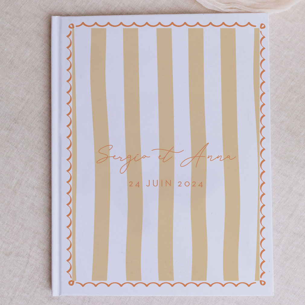 Celui de la collection "Napoli" à la couverture rigide blanche, et au texte coloré, imprimé dans notre atelier, vous séduira par son originalité et son parfum d'Italie. Vous pourrez personnaliser vos prénoms et la date de votre événement sur la page de couverture.
