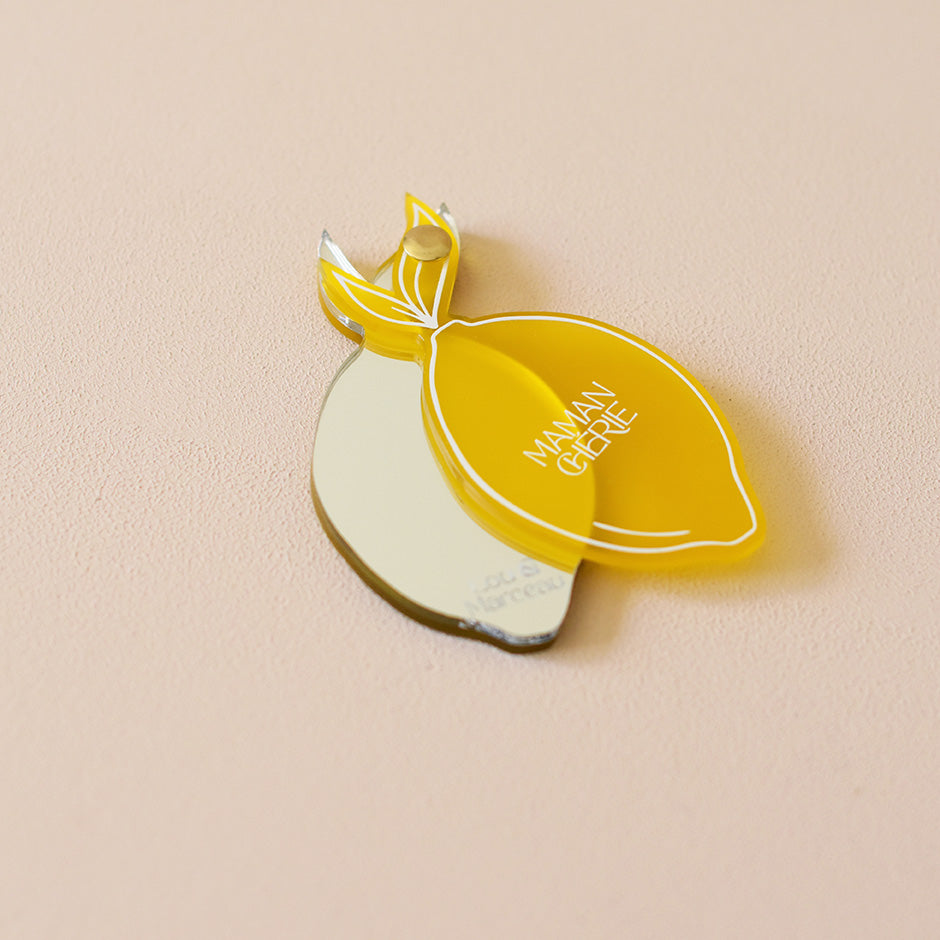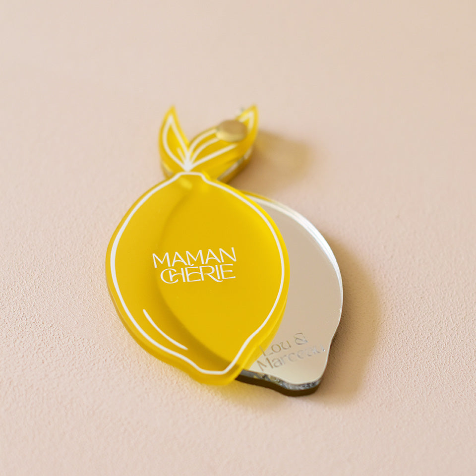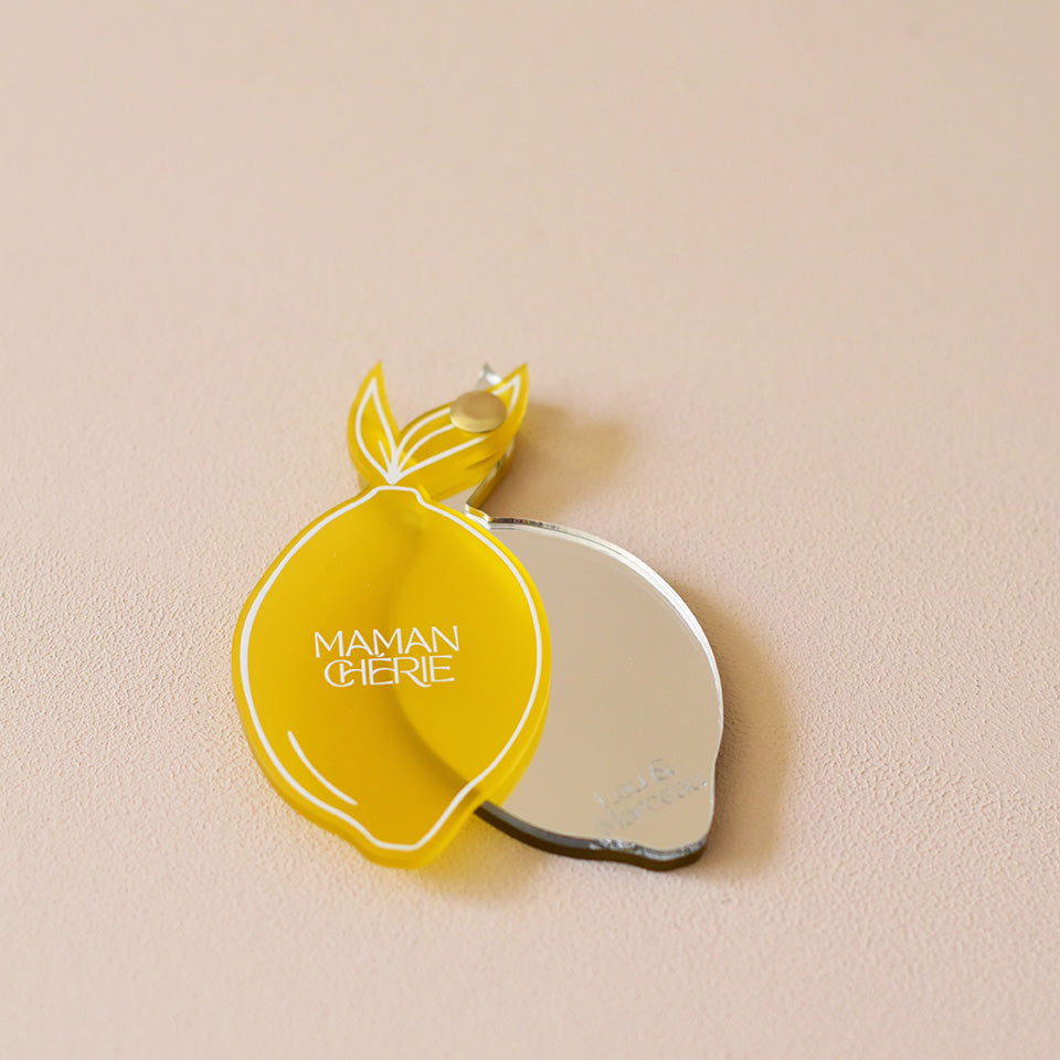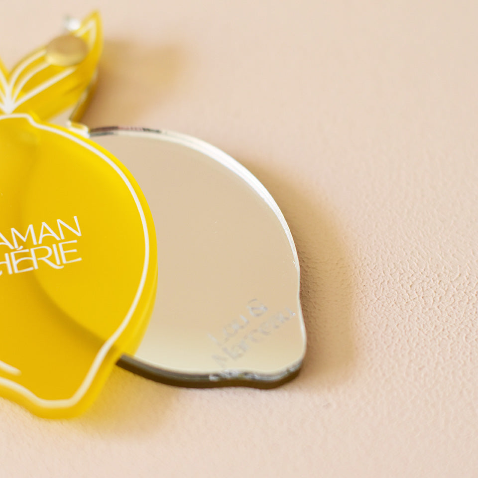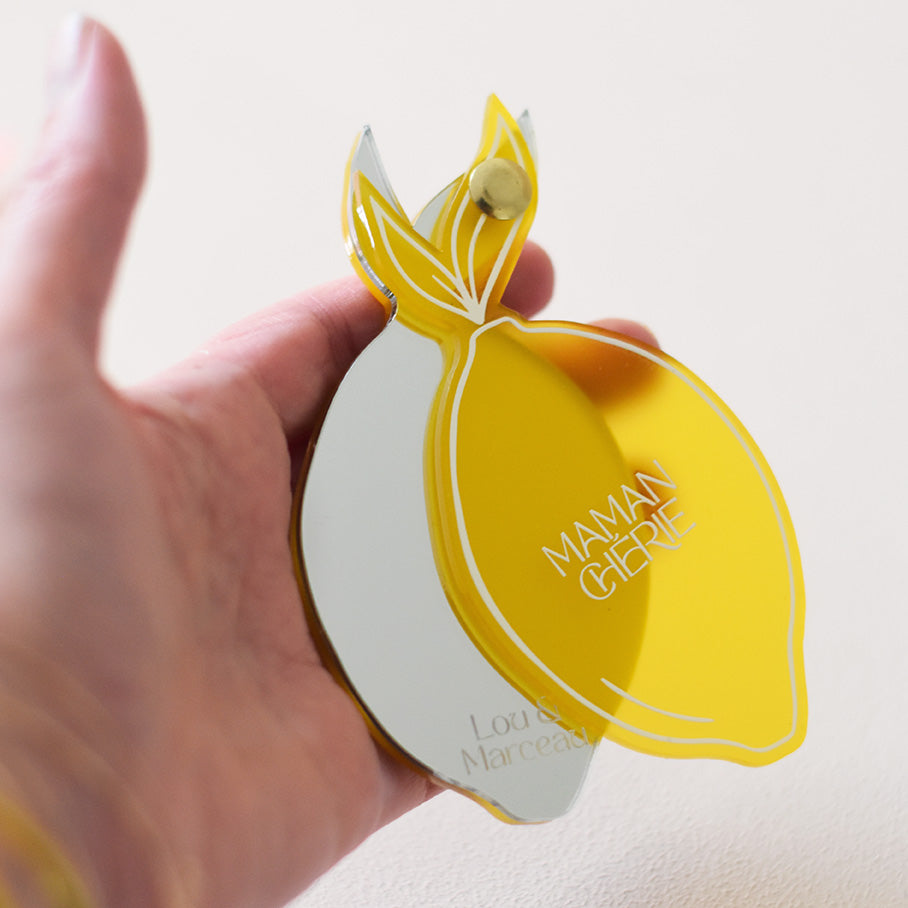 Ce miroir de poche en plexi givré en forme de citron est le parfait cadeau à offrir en toute occasion : pour vos temoins / demoiselles d'honneur, pour la fête des mères, des grands-mères, ou encore pour un anniversaire.