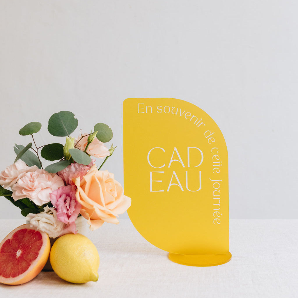 Découvrez notre panneau "cadeaux d'invités" Dolce en plexi givré saffran yellow et texte blanc. Imaginé par Les Mignonneries, il est découpé et imprimé dans notre atelier.