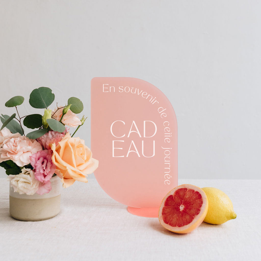 Découvrez notre panneau "cadeaux d'invités" Dolce en plexi givré blush pink et texte blanc. Imaginé par Les Mignonneries, il est découpé et imprimé dans notre atelier.