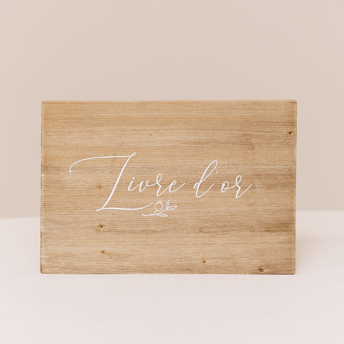 Découvrez notre panneau "Livre d'or" en pin teinté. Imaginé par Les Mignonneries, il est à poser près de votre livre d'or le jour de votre mariage.