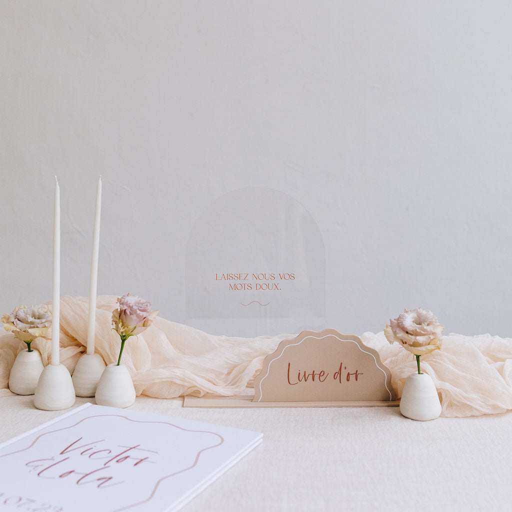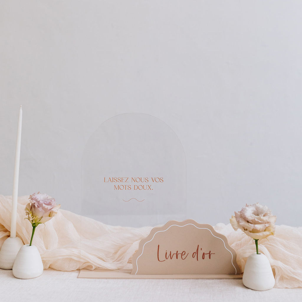 Découvrez notre panneau "Livre d'or" de la collection Curve. Imaginé par Les Mignonneries, il apportera une touche originale et élégante avec ses deux parties en le disposant près de votre livre d'or le jour de votre mariage.