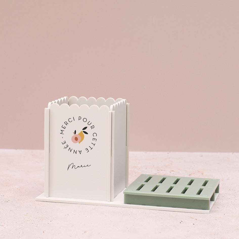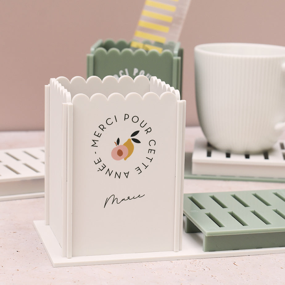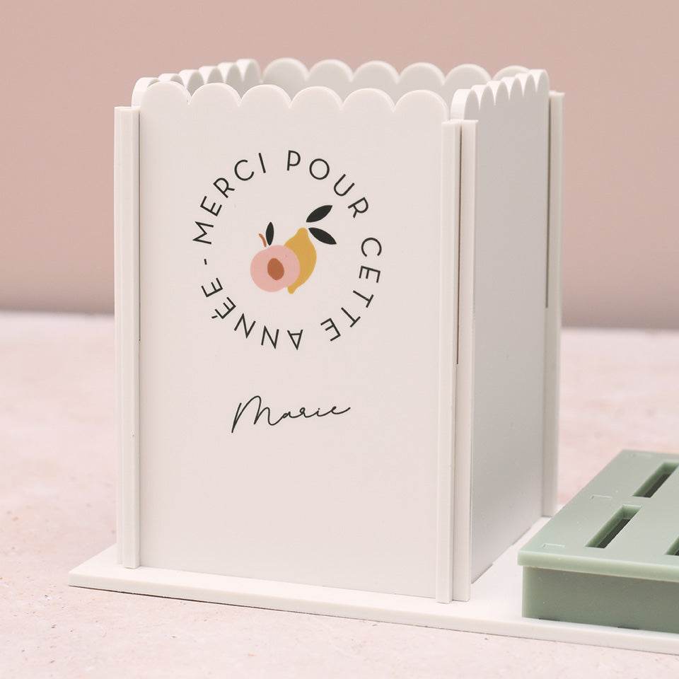Découvrez ce joli pot à crayons et son sous-verre intégré. Il est à personnalisé pour offrir au maitre, la maitresse, l'astem ou la nounou de vos enfants. Il existe en 3 modèles avec des illustrations imaginées par nos soins.