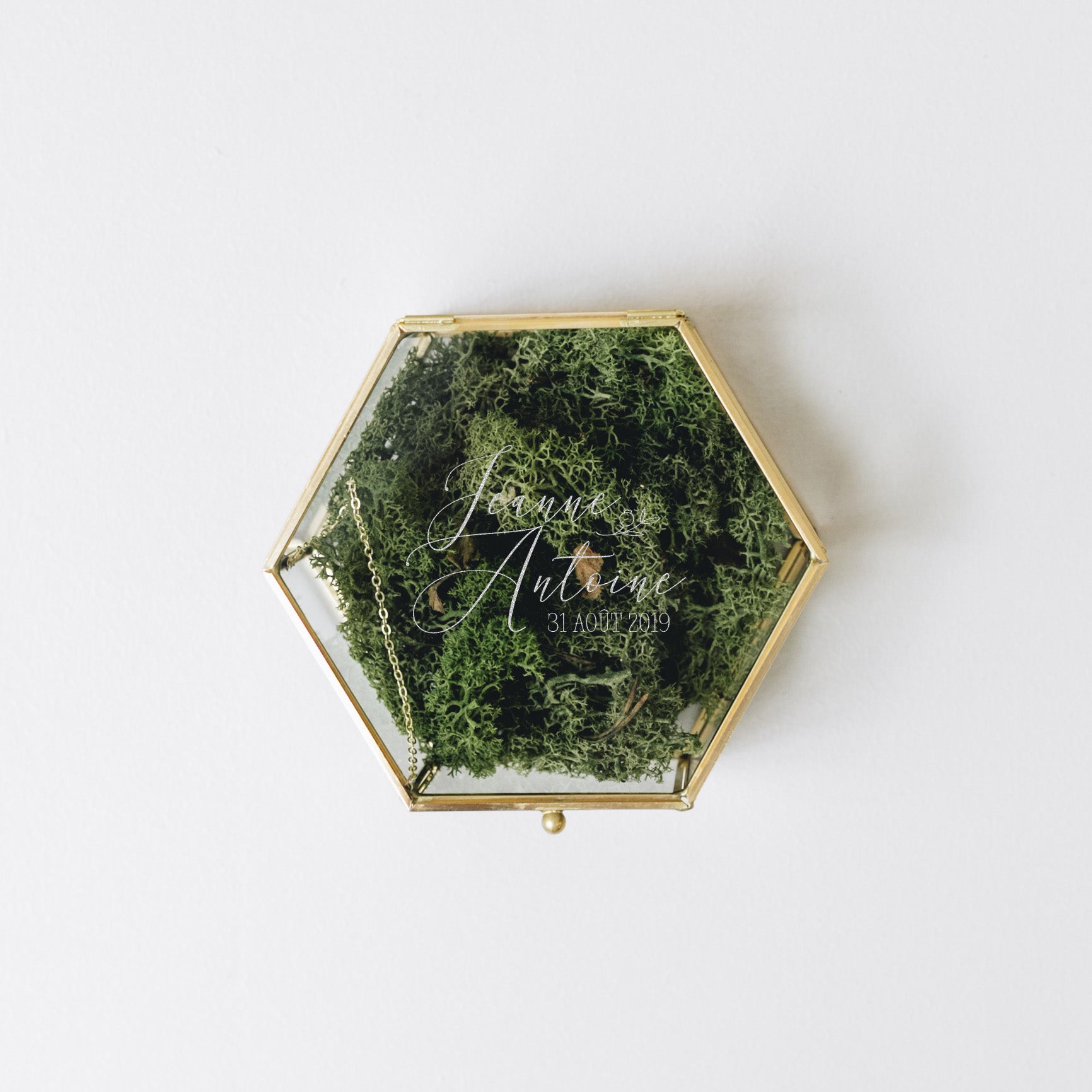 Découvrez la boîte pour alliances hexagonale personnalisée Aurélia. Une boîte à alliances de mariage imaginée par Les Mignonneries à personnaliser avec vos prénoms, ou la date de votre mariage.
