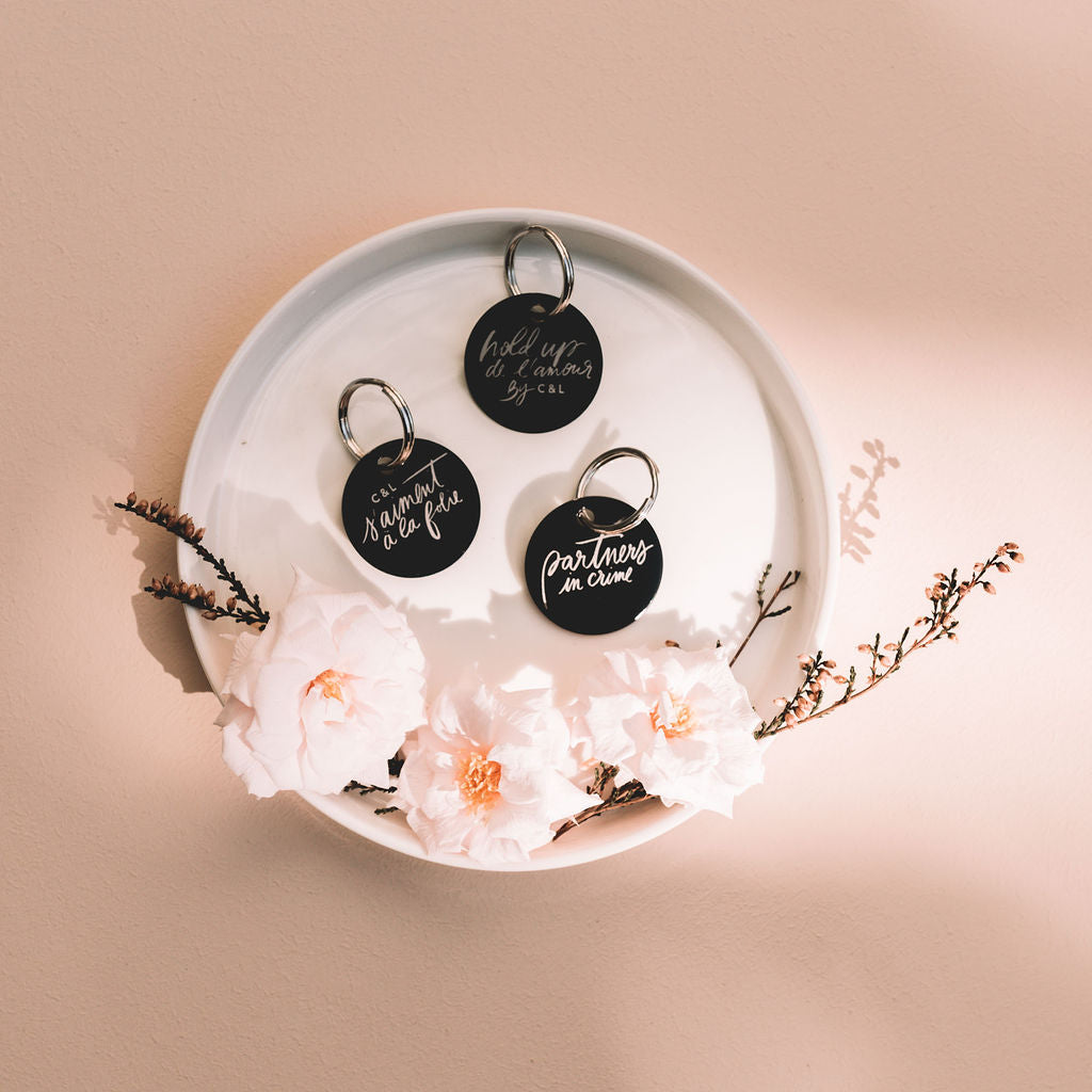 Découvrez nos porte-clés en métal Rebelles. Imaginés par les Bandits events en collaboration avec les Mignonneries, et à personnaliser avec vos initiales, ils sont entièrement personnalisés dans notre atelier. Profitez d'une création unique et sur mesure dont la calligraphie a été réalisée à la main par l'équipe des Bandits puis adaptée aux produits les Mignonneries.