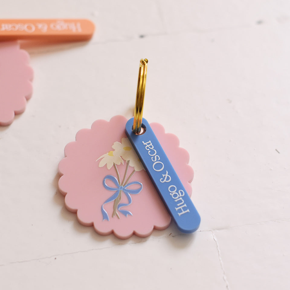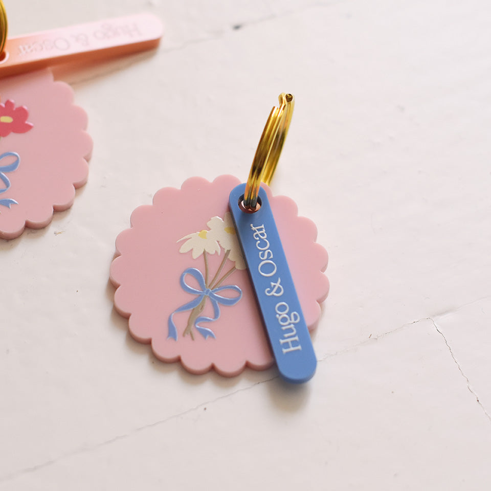 Découvrez le porte clés fleurs imaginé et créé par les Mignonneries pour la fête des mamans. Un porte clés, à personnaliser avec les prénoms de vos enfants sur une petite baguette de la couleur de votre choix.