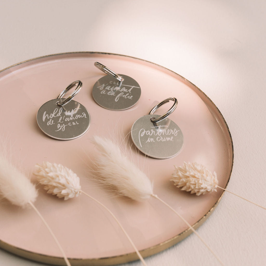 Découvrez nos porte-clés en métal Rebelles. Imaginés par les Bandits events en collaboration avec les Mignonneries, et à personnaliser avec vos initiales, ils sont entièrement personnalisés dans notre atelier. Profitez d'une création unique et sur mesure dont la calligraphie a été réalisée à la main par l'équipe des Bandits puis adaptée aux produits les Mignonneries.
