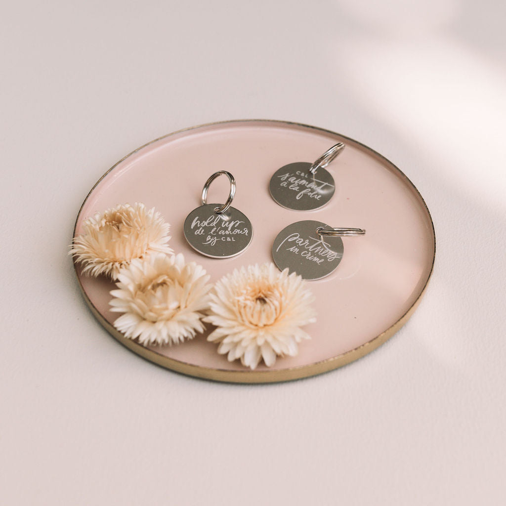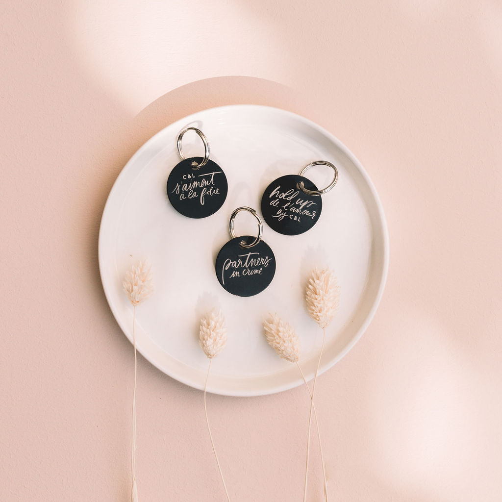 Découvrez nos porte-clés en métal Rebelles. Imaginés par les Bandits events en collaboration avec les Mignonneries, et à personnaliser avec vos initiales, ils sont entièrement personnalisés dans notre atelier. Profitez d'une création unique et sur mesure dont la calligraphie a été réalisée à la main par l'équipe des Bandits puis adaptée aux produits les Mignonneries.