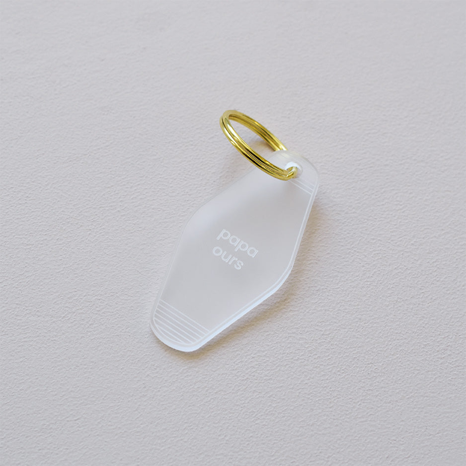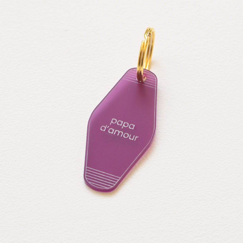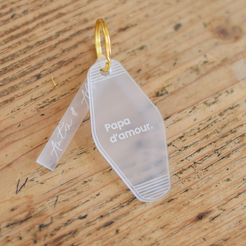 Découvrez nos jolis porte-clés "Papa d'amour". Imaginés par Les Mignonneries et fabriqués en plexi givré translucide dans notre atelier. Vous aurez la possibilité de les personnaliser ou non.