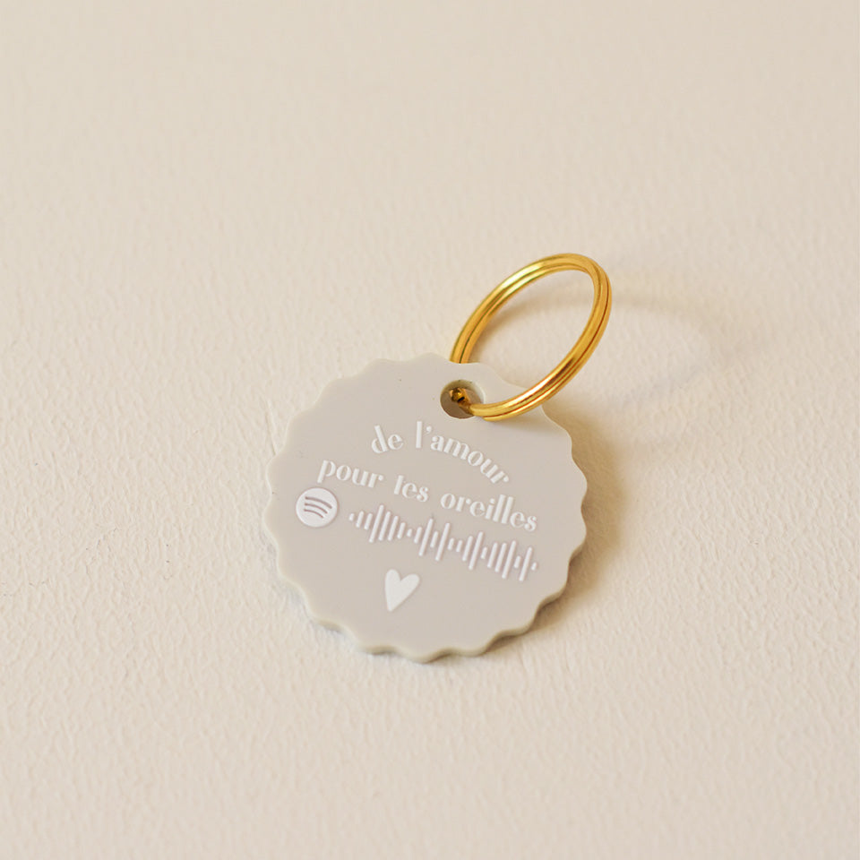 Envoyez-nous simplement un lien vers un morceau, une playlist ou un album sur spotify, et nous imprimerons ce code à flasher sur un joli porte clés. Pas besoin de créer un compte ou de payer un abonnement pour obtenir ce service !