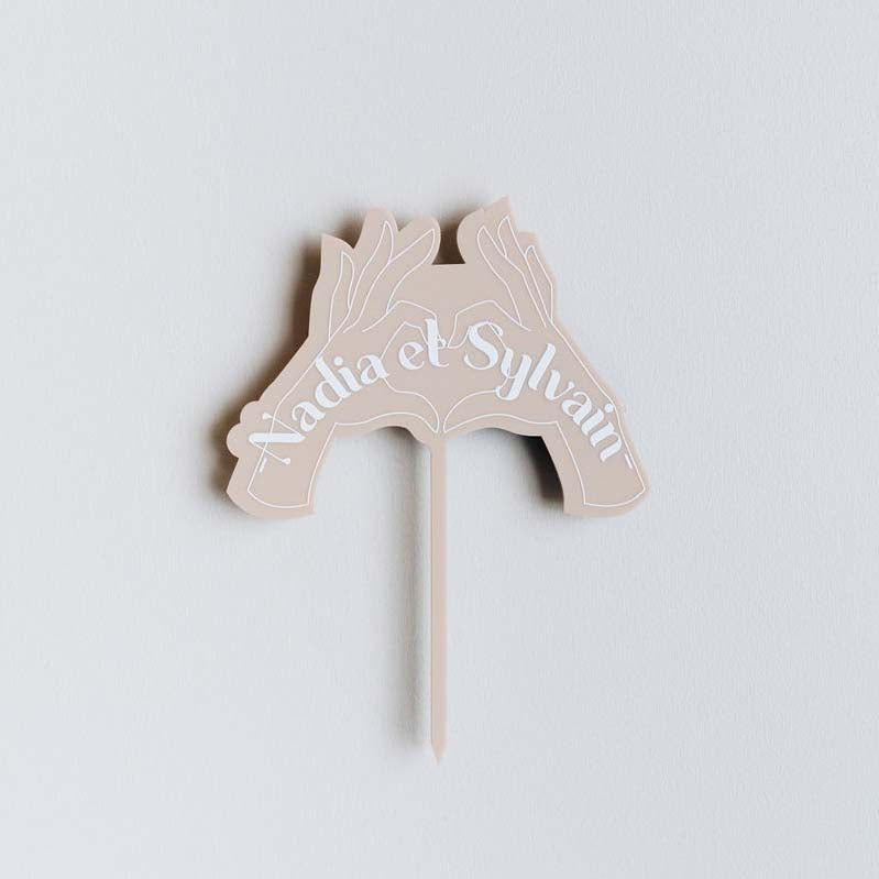 Découvrez notre cake topper Hands en plexi nude. Imaginé par Les Mignonneries il est à personnaliser avec vos prénoms.