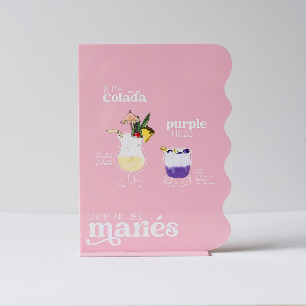 Cette carte à disposer sur le bar de votre mariage au moment du cocktail ou de la fin de soirée sera une belle indication pour vos invités et participera à votre décoration de la plus jolie des façons ! 3 matériaux au choix, et vos cocktails sur mesure sans limite...!