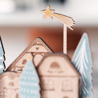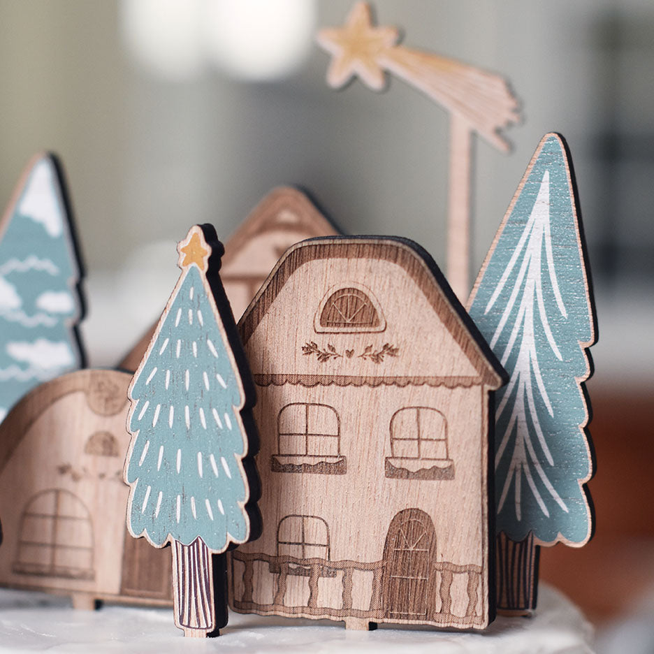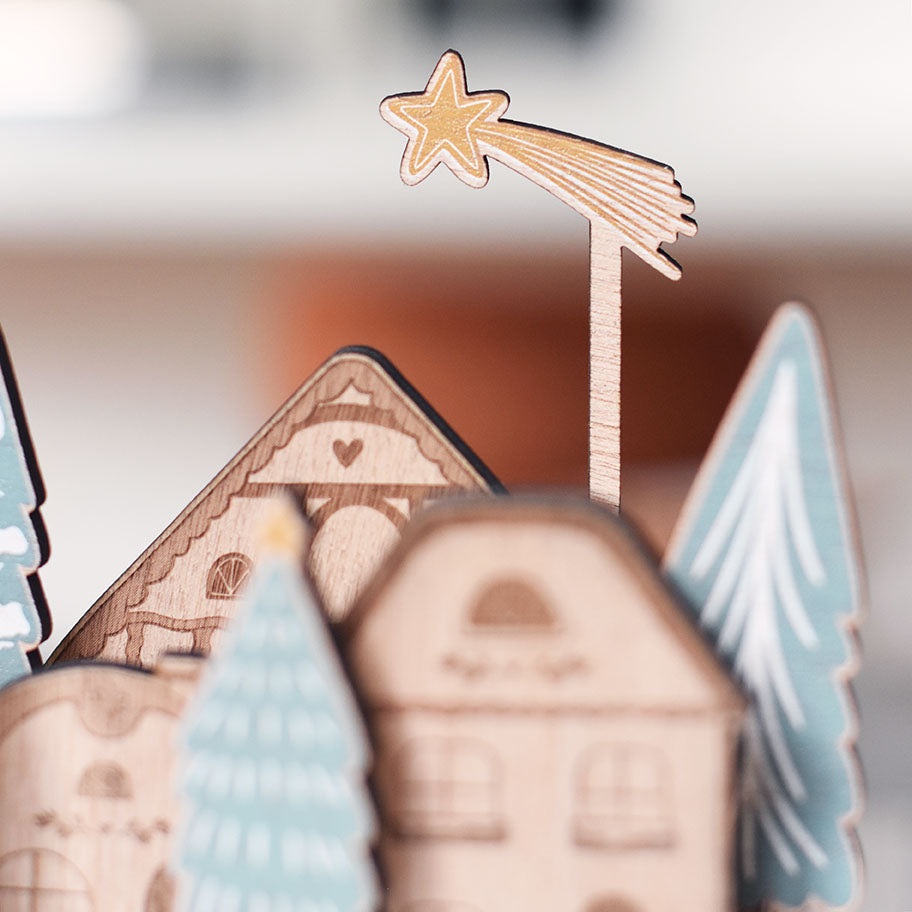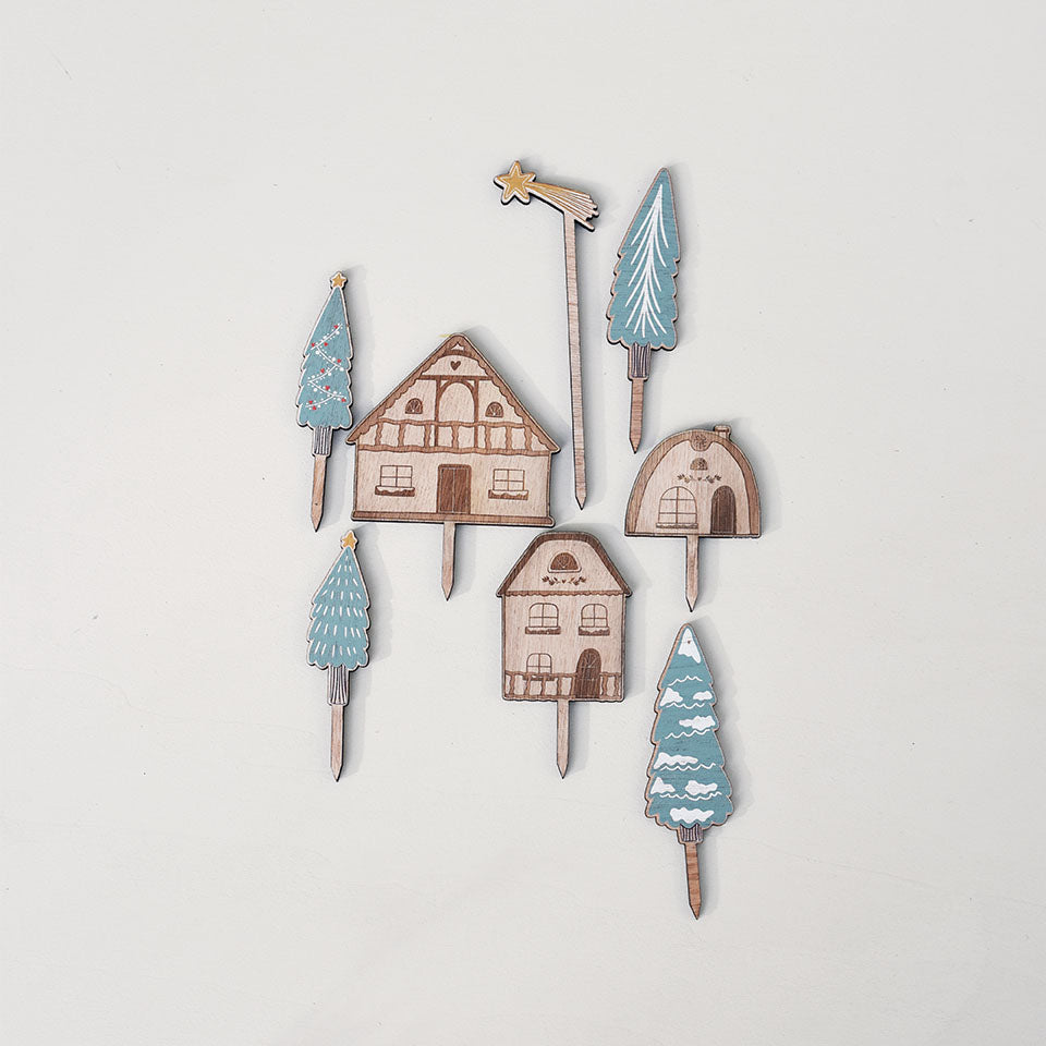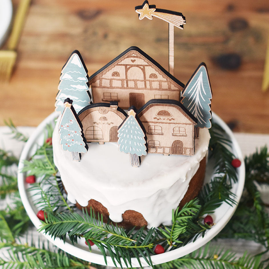 Découvrez notre cake topper Village de Noël. Imaginé par Les Mignonneries comme un petit paysage à planter sur votre gâteau, il créera tout de suite un superbe effet. Ce cake topper est composé de 3 chalets, 4 sapins et une étoile filante.