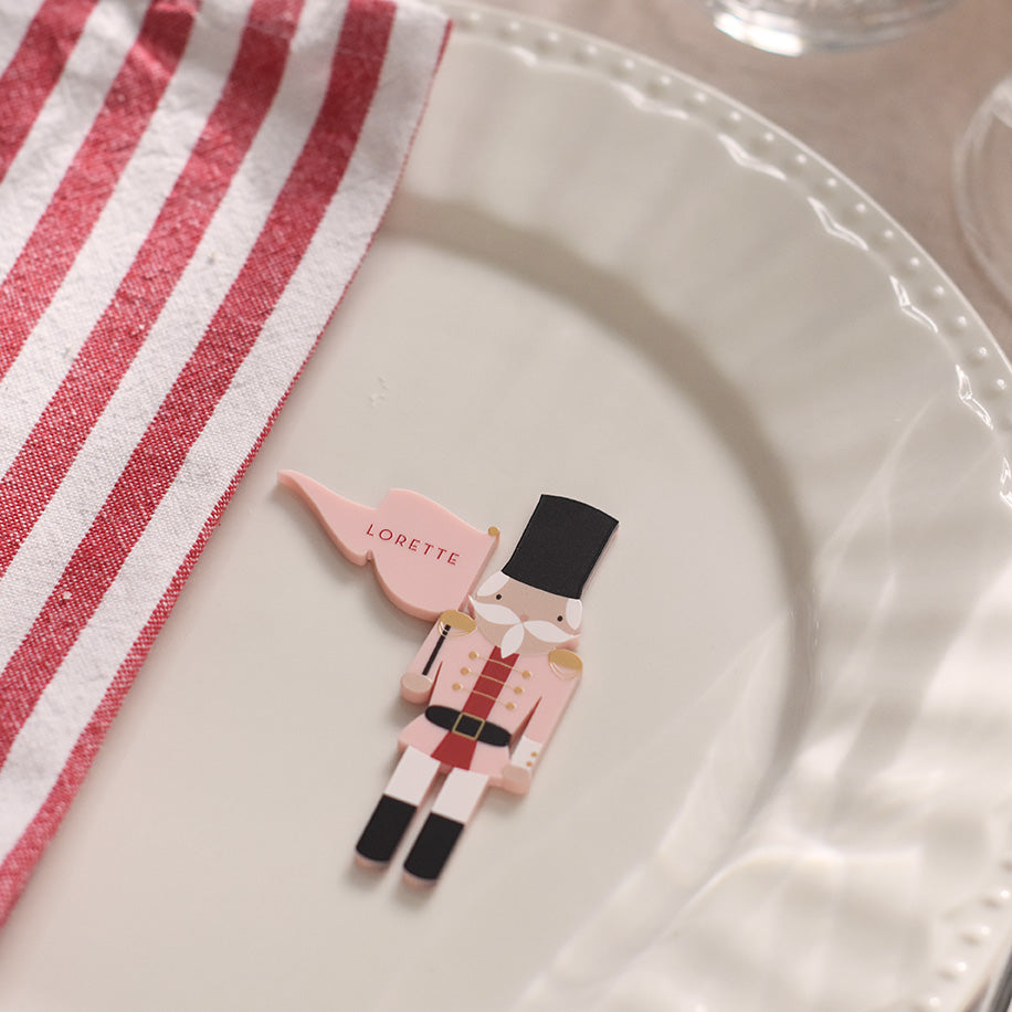 Découvrez les marque-places Casse-Noisette de Noël. Imaginés par les Mignonneries, et à personnaliser avec les prénoms de vos invités, ils sont entièrement créés dans notre atelier. Profitez d'une création unique disponible dans deux coloris principaux : rose (baby pink) et miroir rouge.