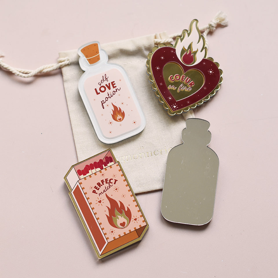 Le miroir de poche “Cœur on Fire” est une création originale Les Mignonneries, inspirée des cœurs sacrés revisités avec une touche moderne et graphique.