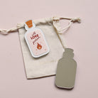 Réalisés en plexiglas givré blanc, ils prennent la forme d’une petite fiole illustrée, ornée du message « Love Potion » ou « Self Love Potion ».