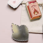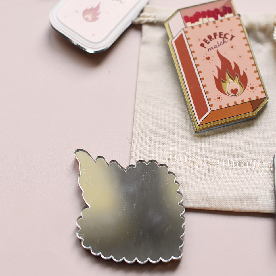 Ce miroir de poche en plexiglas miroir doré, imaginé et entièrement dessiné par Les Mignonneries, représente une délicate boîte d’allumettes illustrée du message « Perfect Match ».