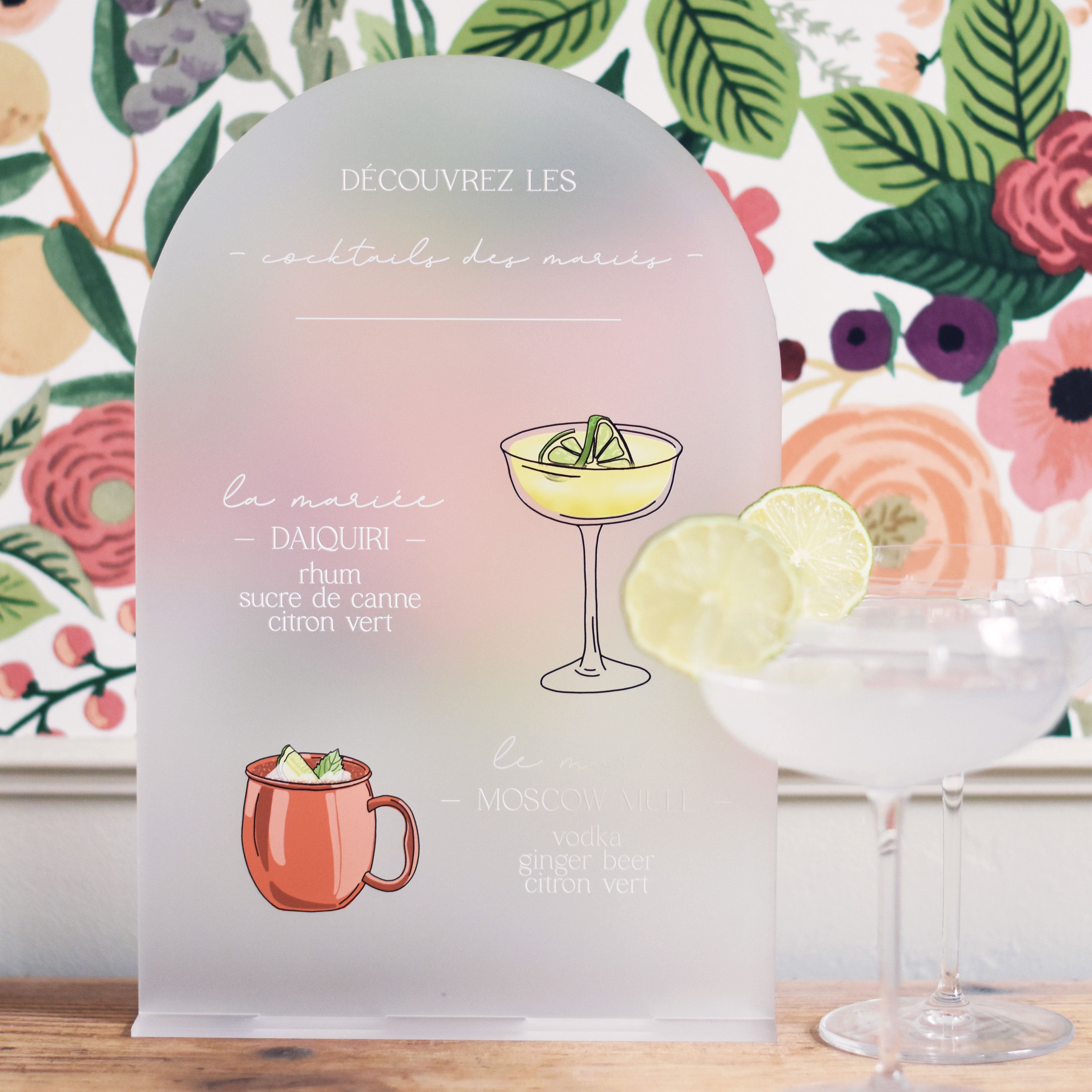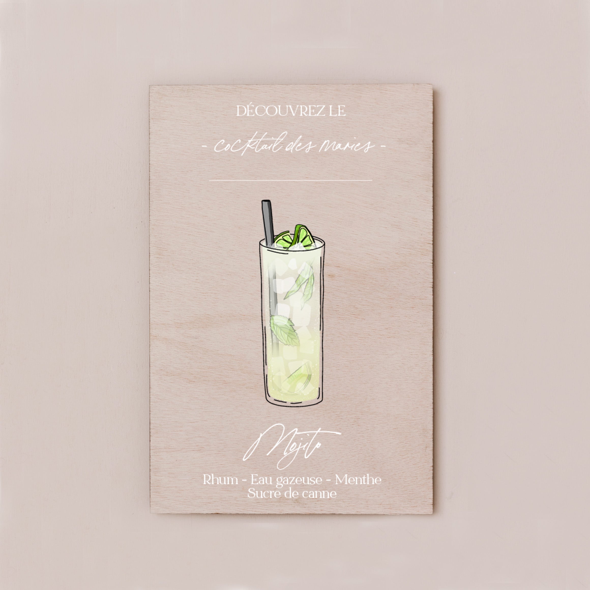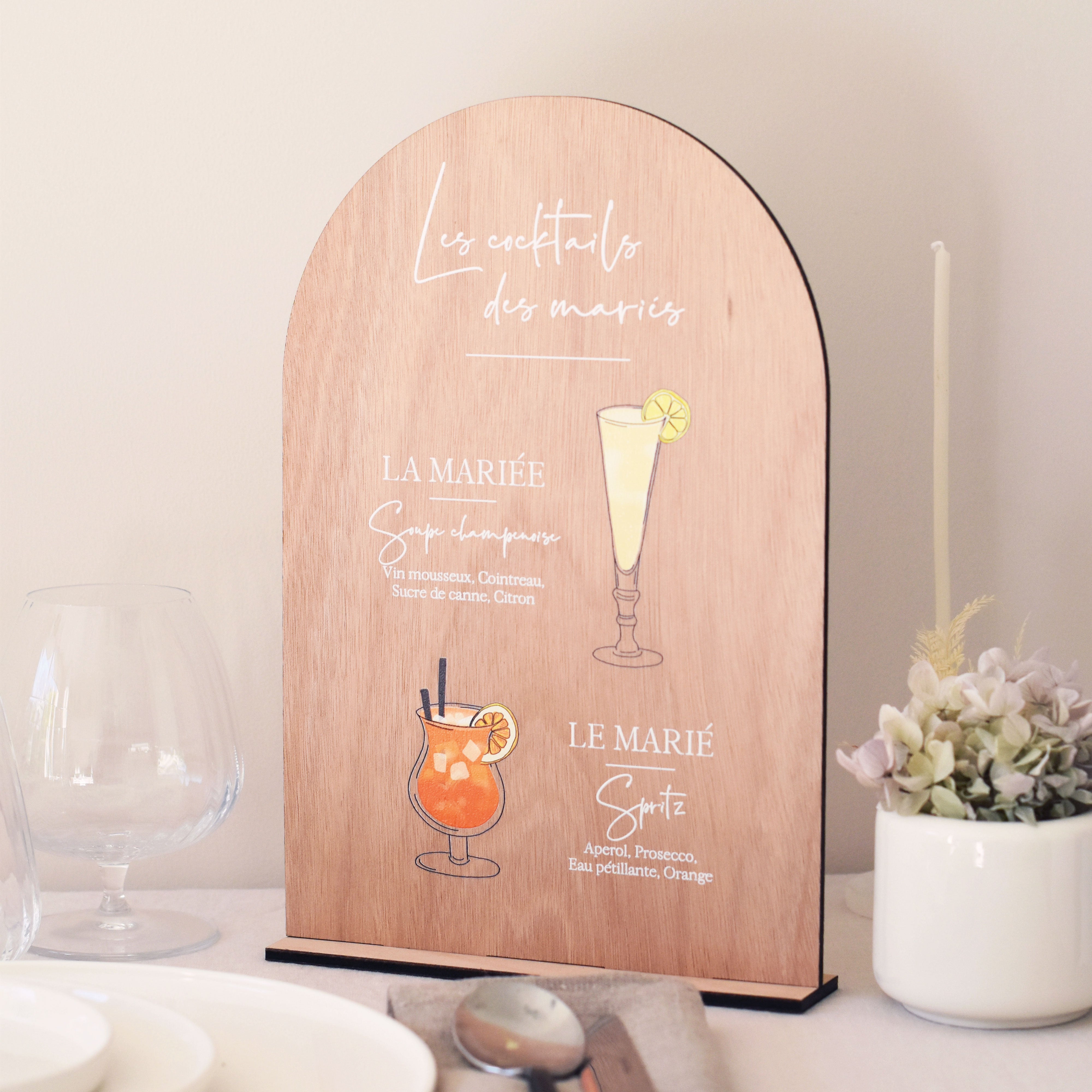 Ces cartes à disposer sur le bar de votre mariage au moment du cocktail ou de la fin de soirée seront une belle indication pour vos invités et participeront à votre décoration de la plus jolie des façons ! Plusieurs matériaux au choix, plusieurs styles de police également, et vos cocktails sur mesure sans limite...!