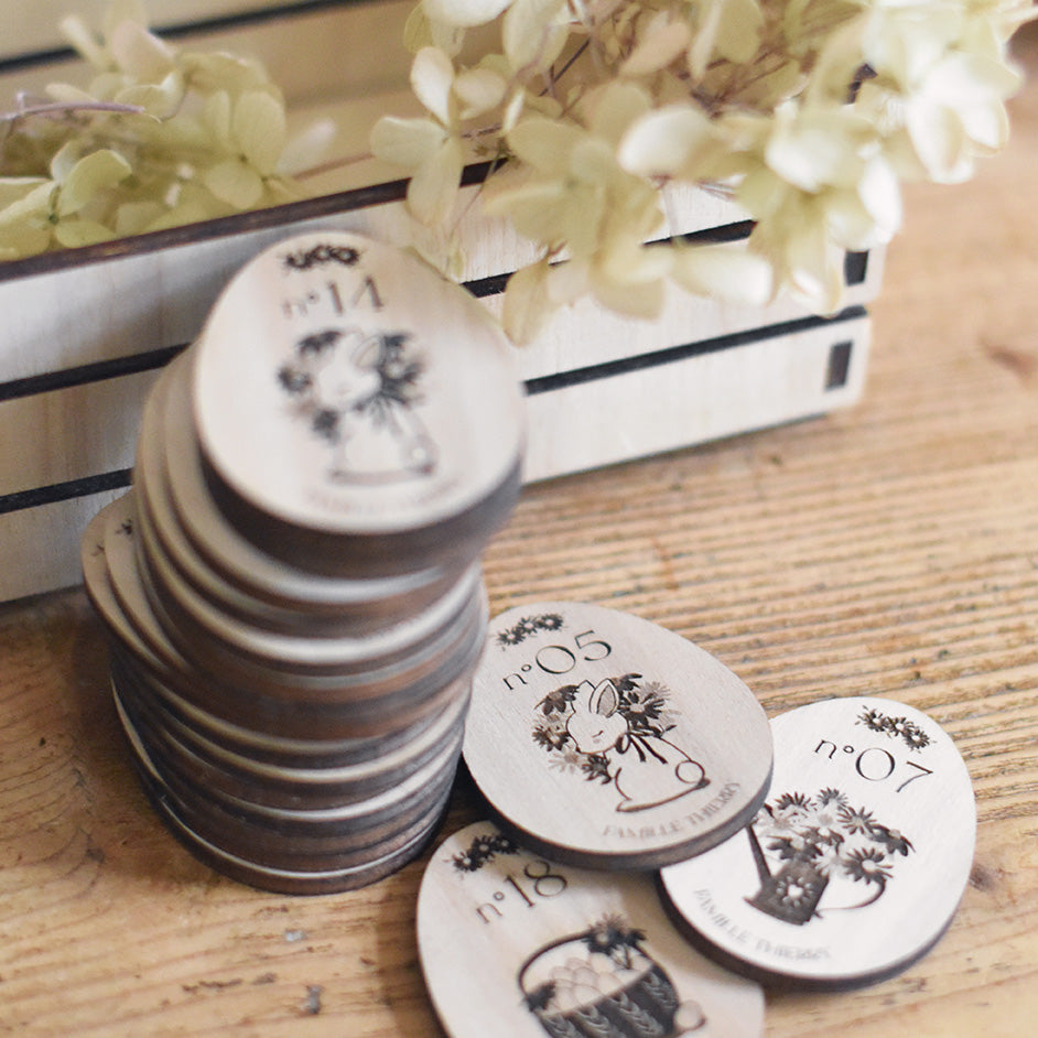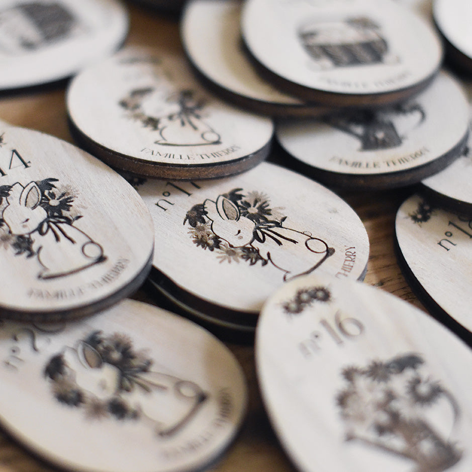 Le lot est composé de 3 modèles différents aux illustrations Les Mignonneries. Fabriqué à partir de peuplier, il est coupé et gravé dans notre atelier.