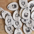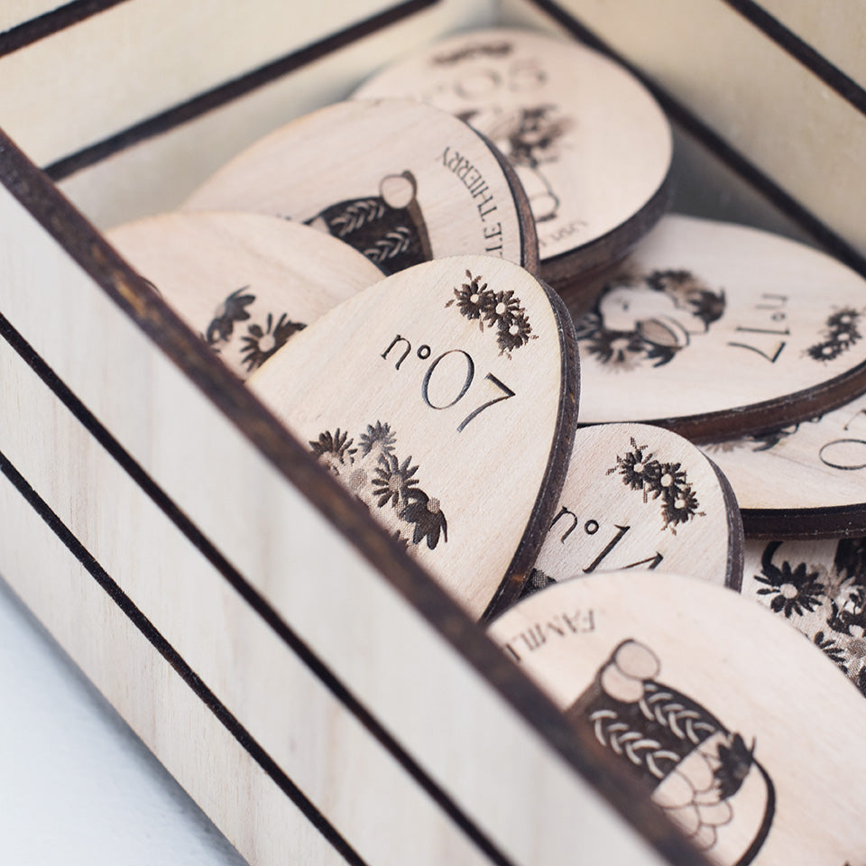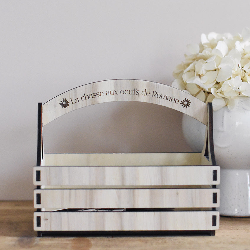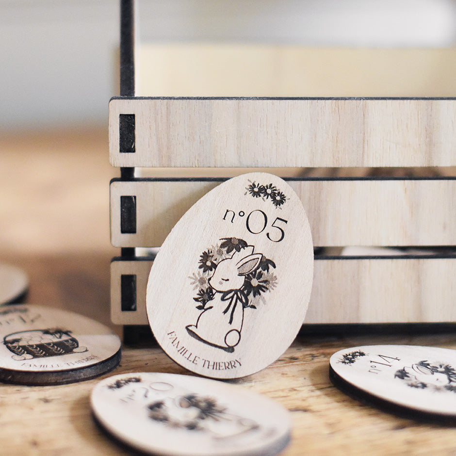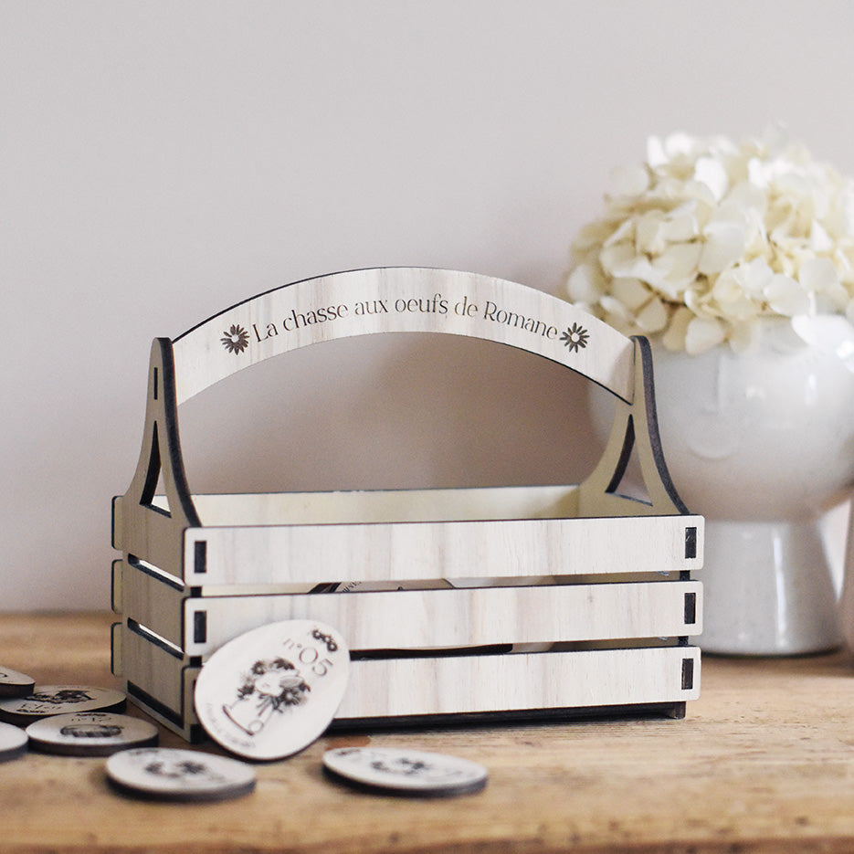 Le lot est composé de 20 oeufs de Pâques et d'un joli panier aux illustrations Les Mignonneries. Fabriqués à partir de peuplier, les éléments sont coupés, gravés et assemblés dans notre atelier.