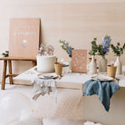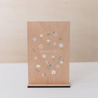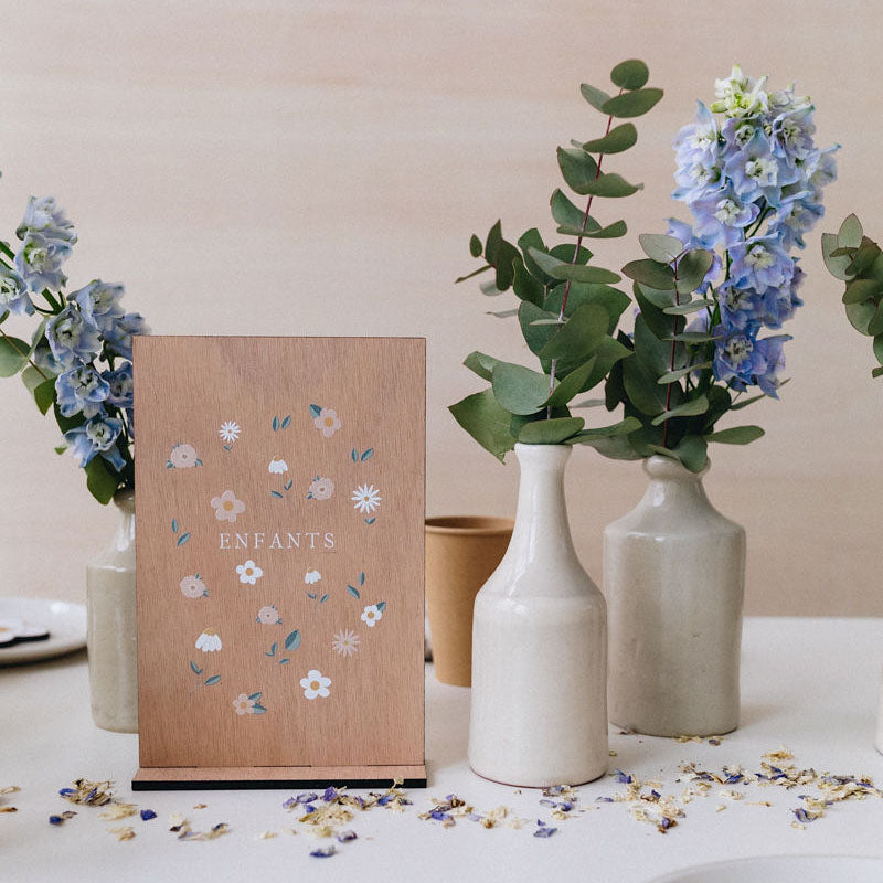 Découvrez notre petite signalétique Fleurs modèle 2 en bois imprimé à personnaliser avec le texte de votre choix pour différencier les espaces cadeaux, table des enfants, bonbons ou gâteau.