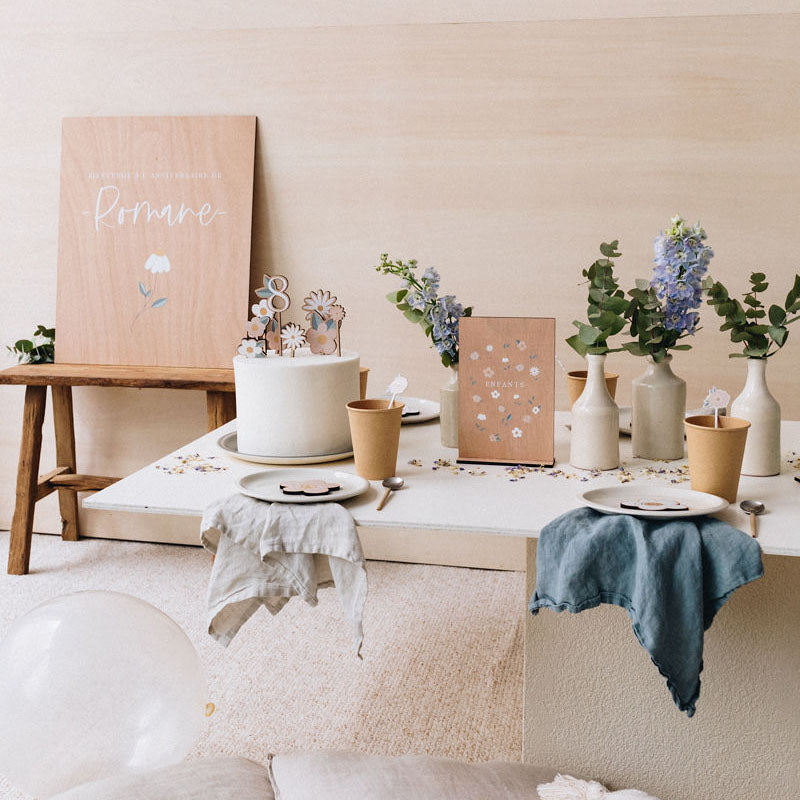 Ce panneau en bois fait partie de notre collection Fleurs. Cette collection en bois et plexi plaira à vos enfants pour son côté ludique et amusant. Nous avons imaginé de jolis accessoires pour la décoration de vos fêtes d'anniversaires, baptême ou table des enfants lors de votre mariage.