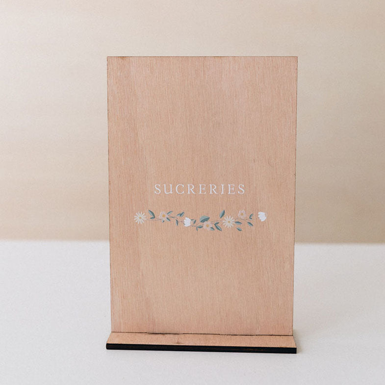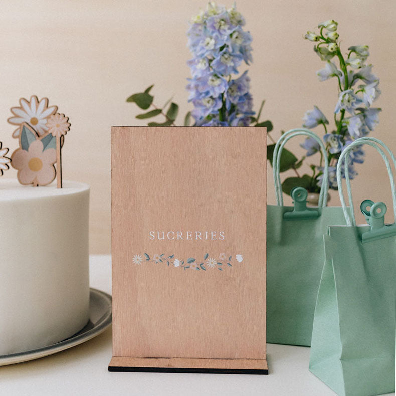 Découvrez notre petite signalétique Fleurs modèle 3 en bois imprimé à personnaliser avec le texte de votre choix pour différencier les espaces cadeaux, table des enfants, bonbons ou gâteau.