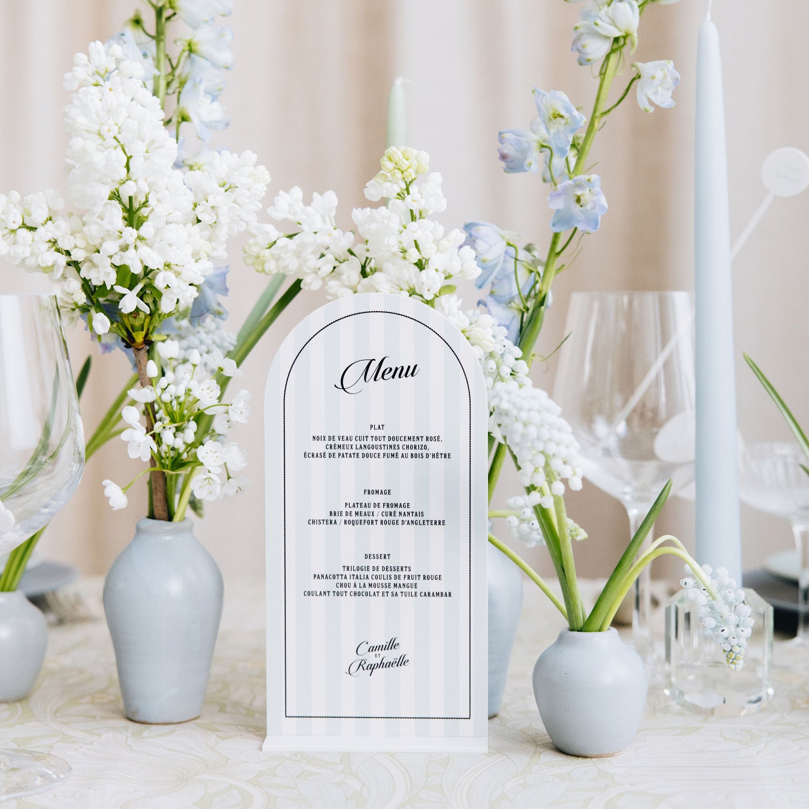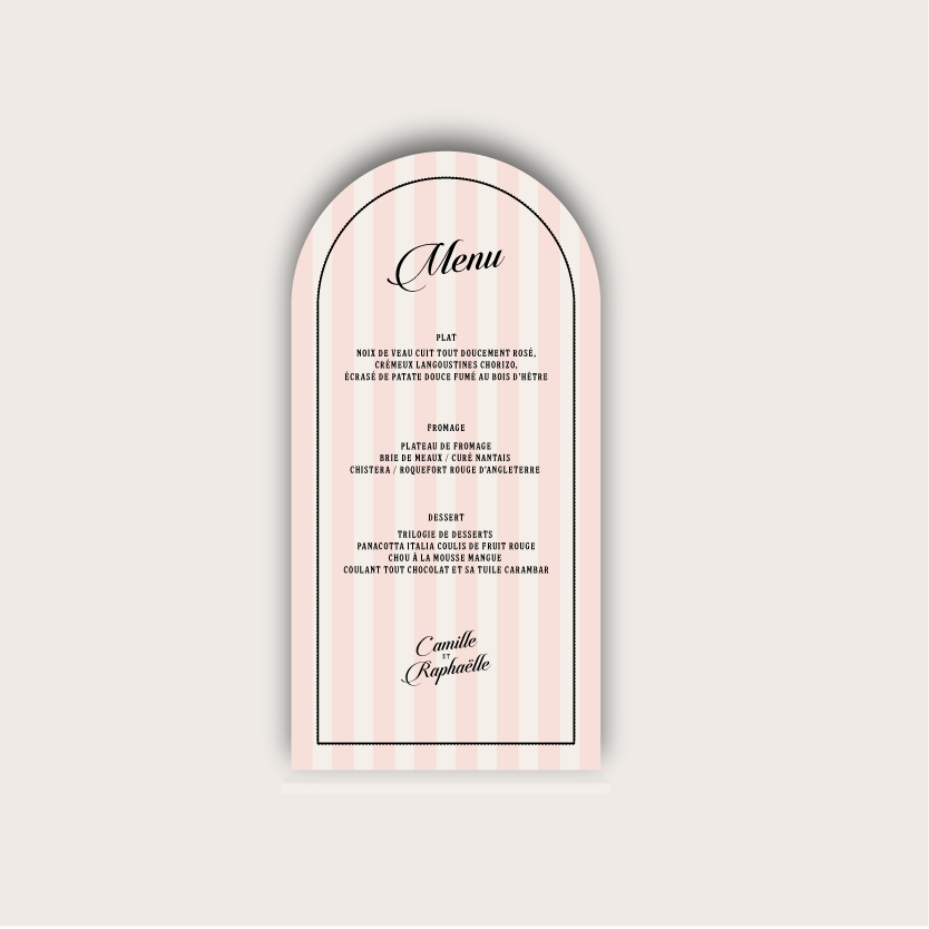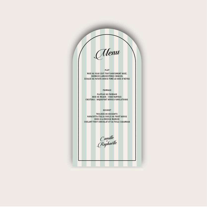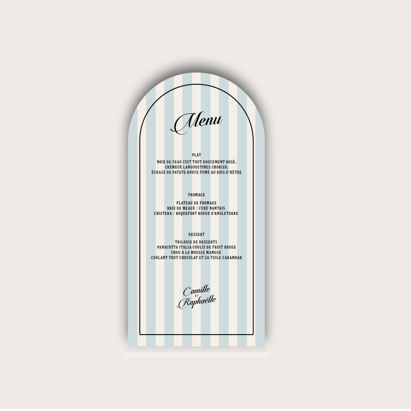 Ces menus font partie de notre collection Gaspard, une collection à l’esprit campagne chic anglaise, qui mélange les formes, les rayures et les tons pastel pour apporter une touche de caractère à votre décoration.