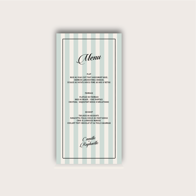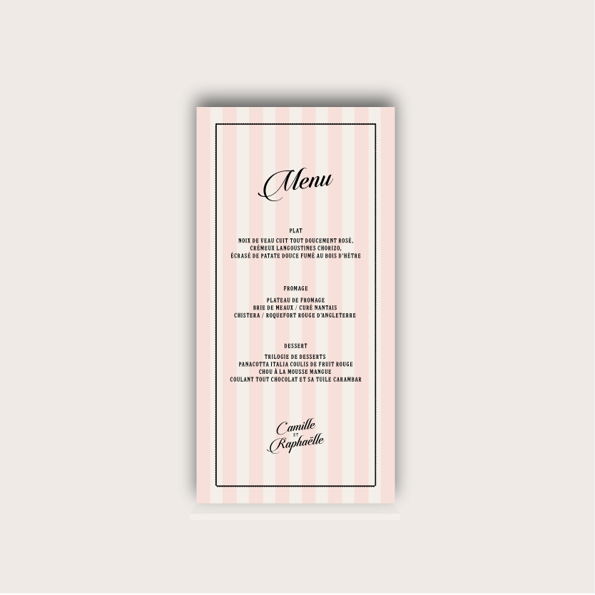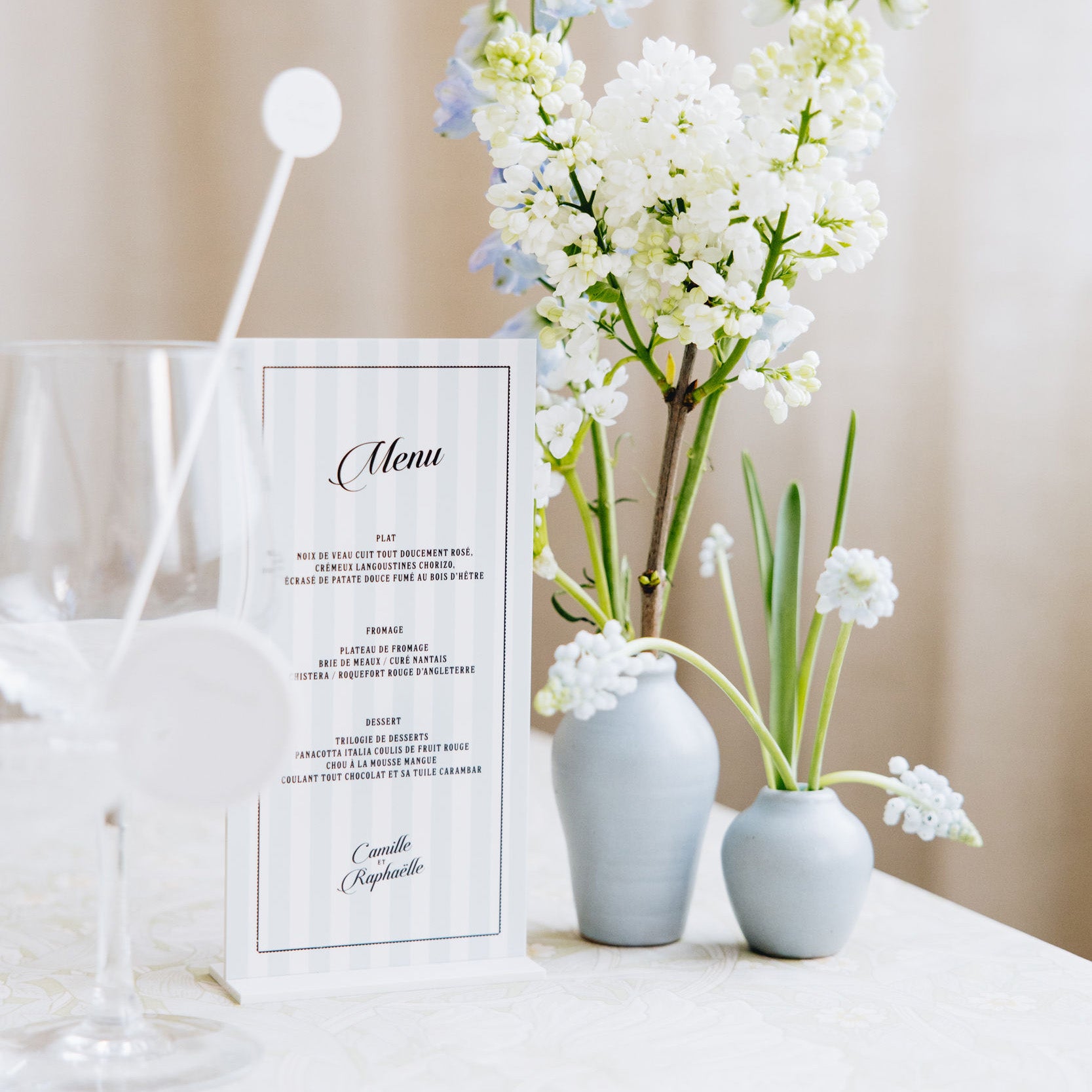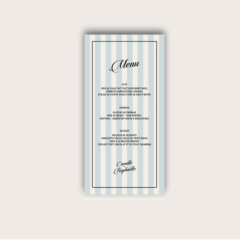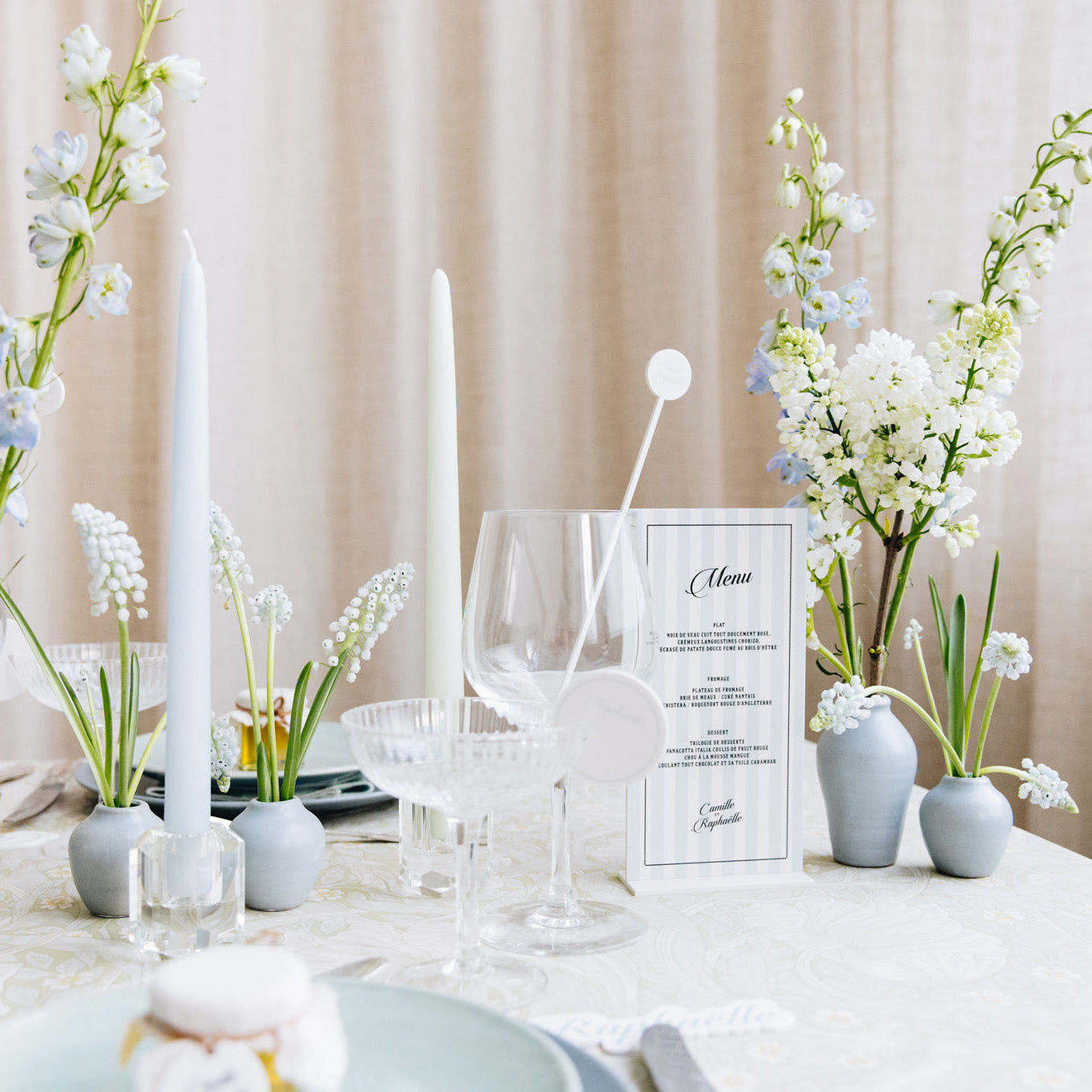 Ces menus font partie de notre collection Gaspard, une collection à l’esprit campagne chic anglaise, qui mélange les formes, les rayures et les tons pastel pour apporter une touche de caractère à votre décoration.