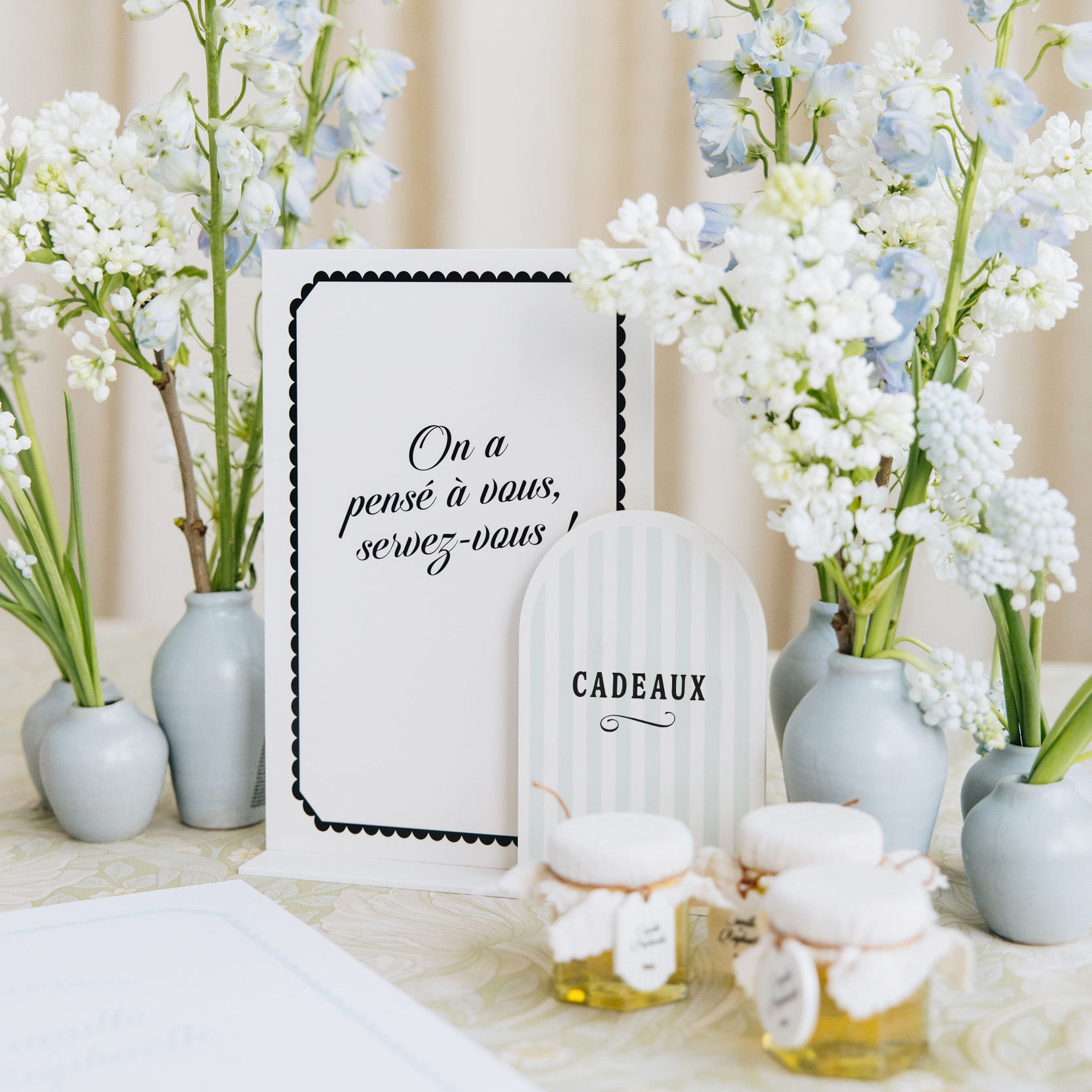 Nos panneaux personnalisés sont une jolie touche à apporter à votre espace cadeaux d’invités pour votre mariage ou votre évènement tout en permettant à chacun de se repérer.