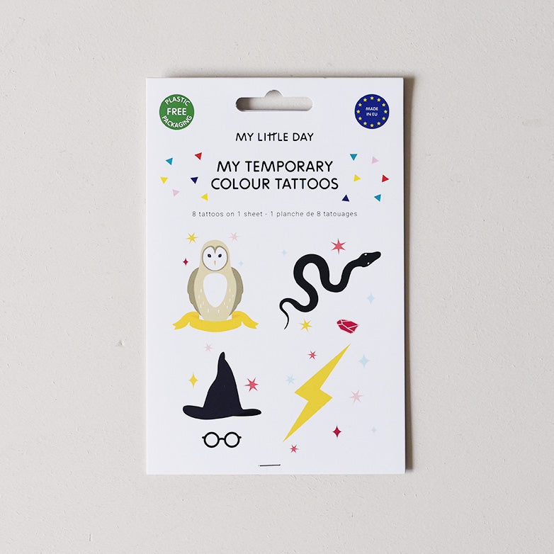Vous avez toujours rêvé d'intégrer une célèbre école de magie et d'apprendre à jeter des sorts les plus surprenants les uns des autres ? En attendant de recevoir votre lettre d'admission, craquez pour cette collection sorcier qui convient aussi bien pour un anniversaire que pour Halloween. Une planche de 8 tatouages aux motifs ensorcelants à découper.