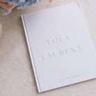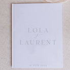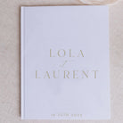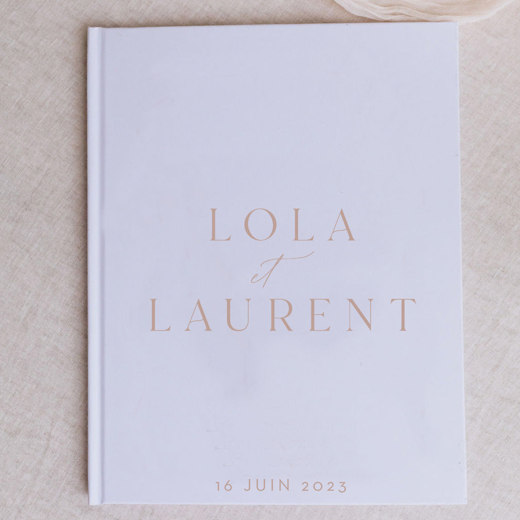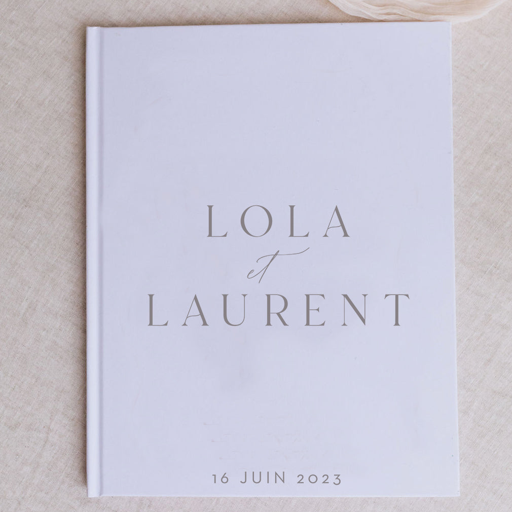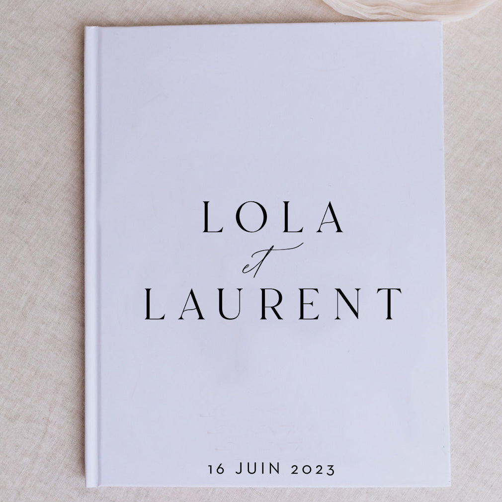 Celui de la collection "Lola" à la couverture rigide blanche, et au texte imprimé dans notre atelier, vous séduira par sa simplicité et son élégance. Vous pourrez personnaliser vos prénoms et la date de votre événement sur la page de couverture.