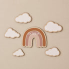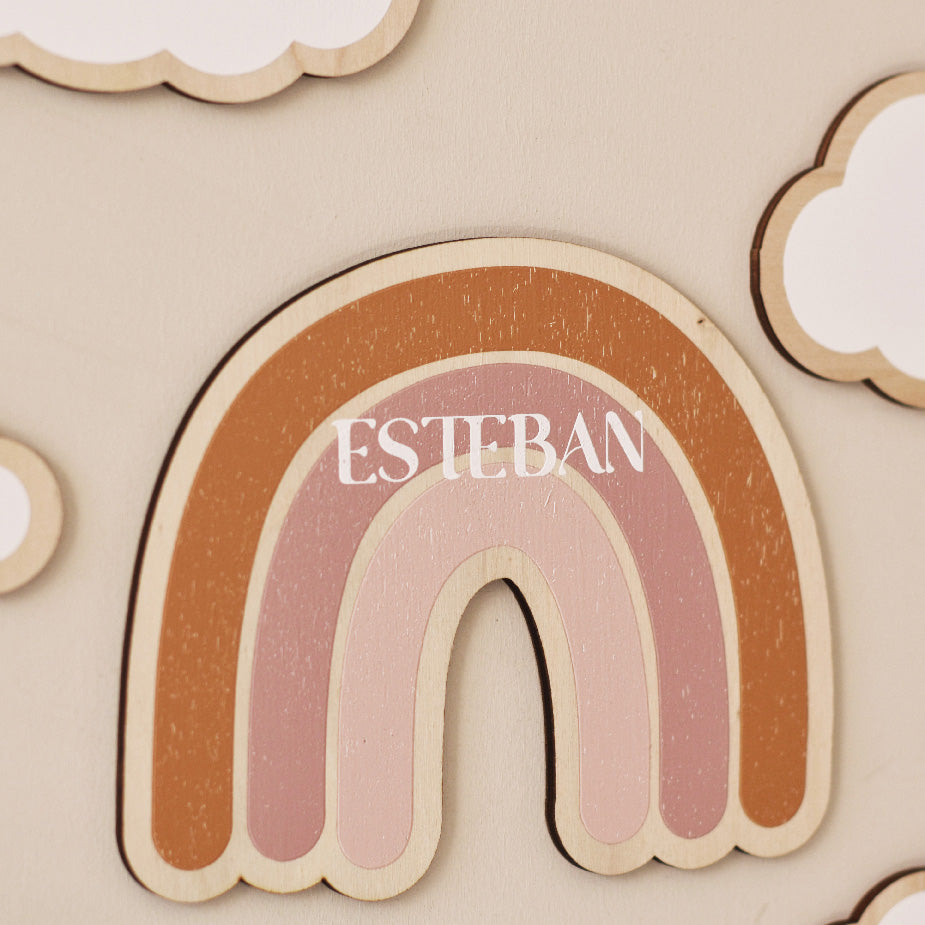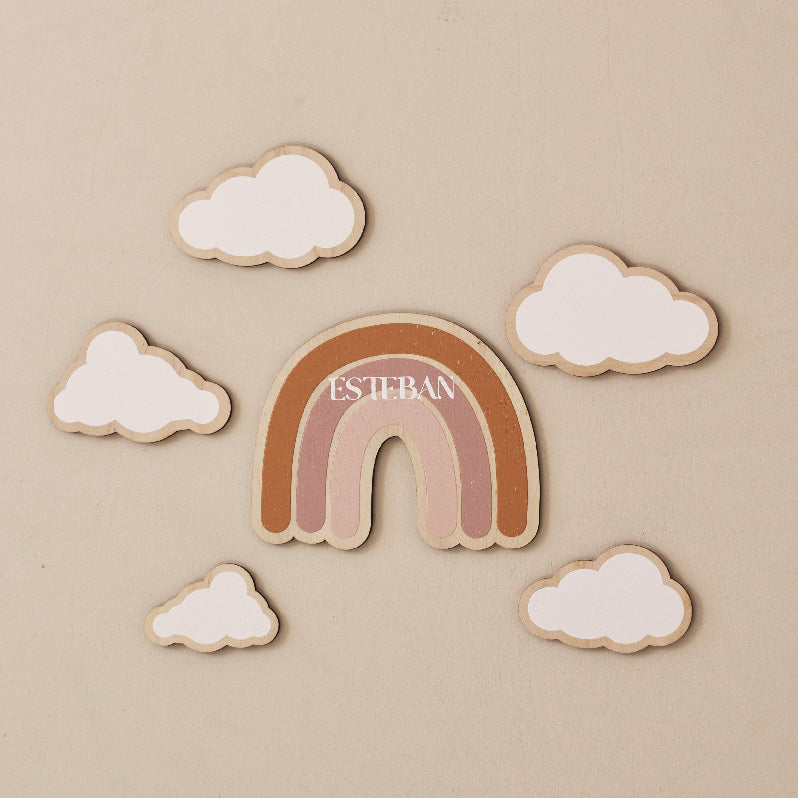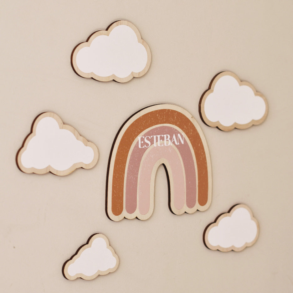 Découvrez ce décor Arc-en-ciel personnalisable. Un ensemble de six illustrations dont un joli arc-en-ciel imaginé par Les Mignonneries, à fixer au mur grâce à l'adhésif dont ils sont recouverts au dos. En bois imprimé, ils sont coupés et imprimés dans notre atelier.