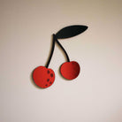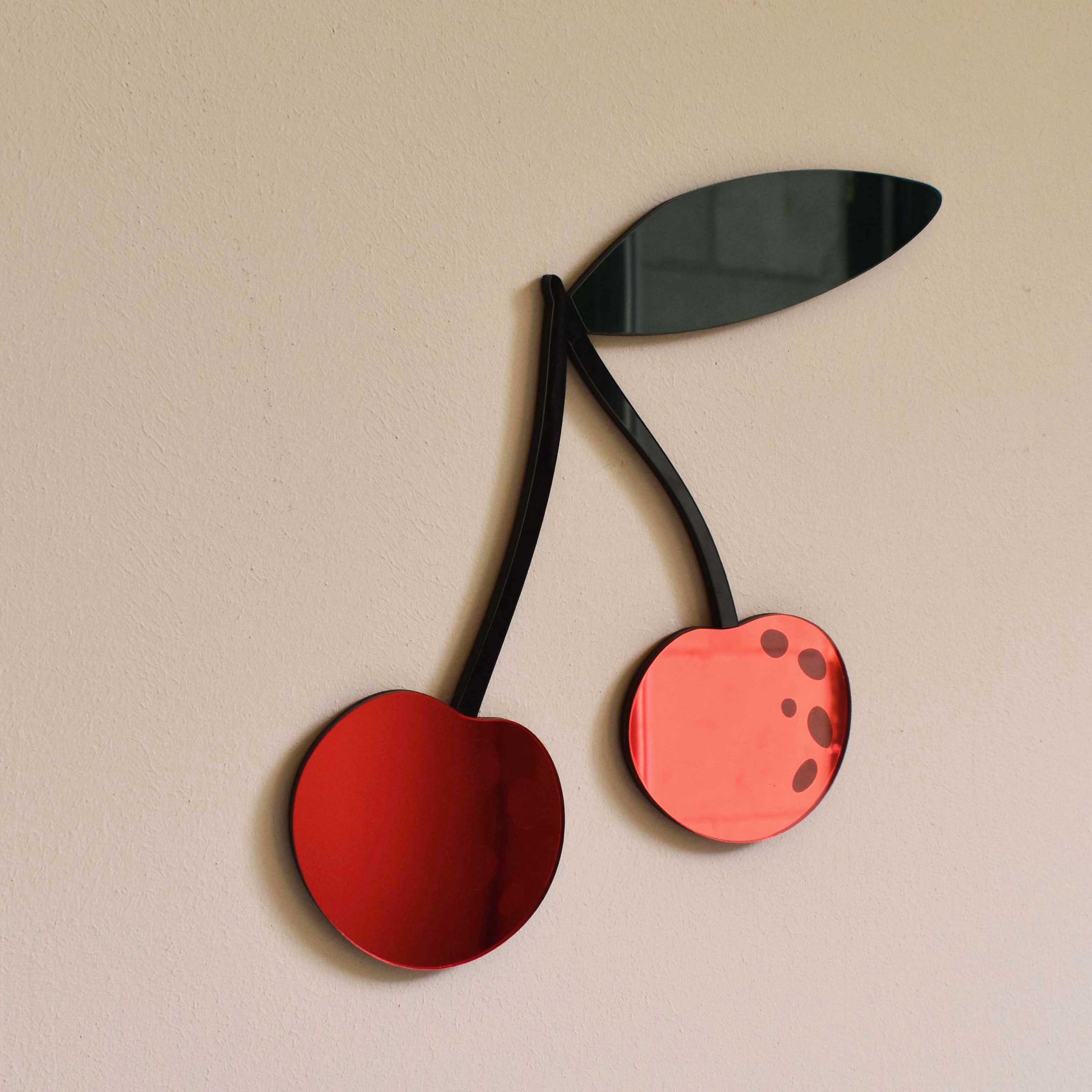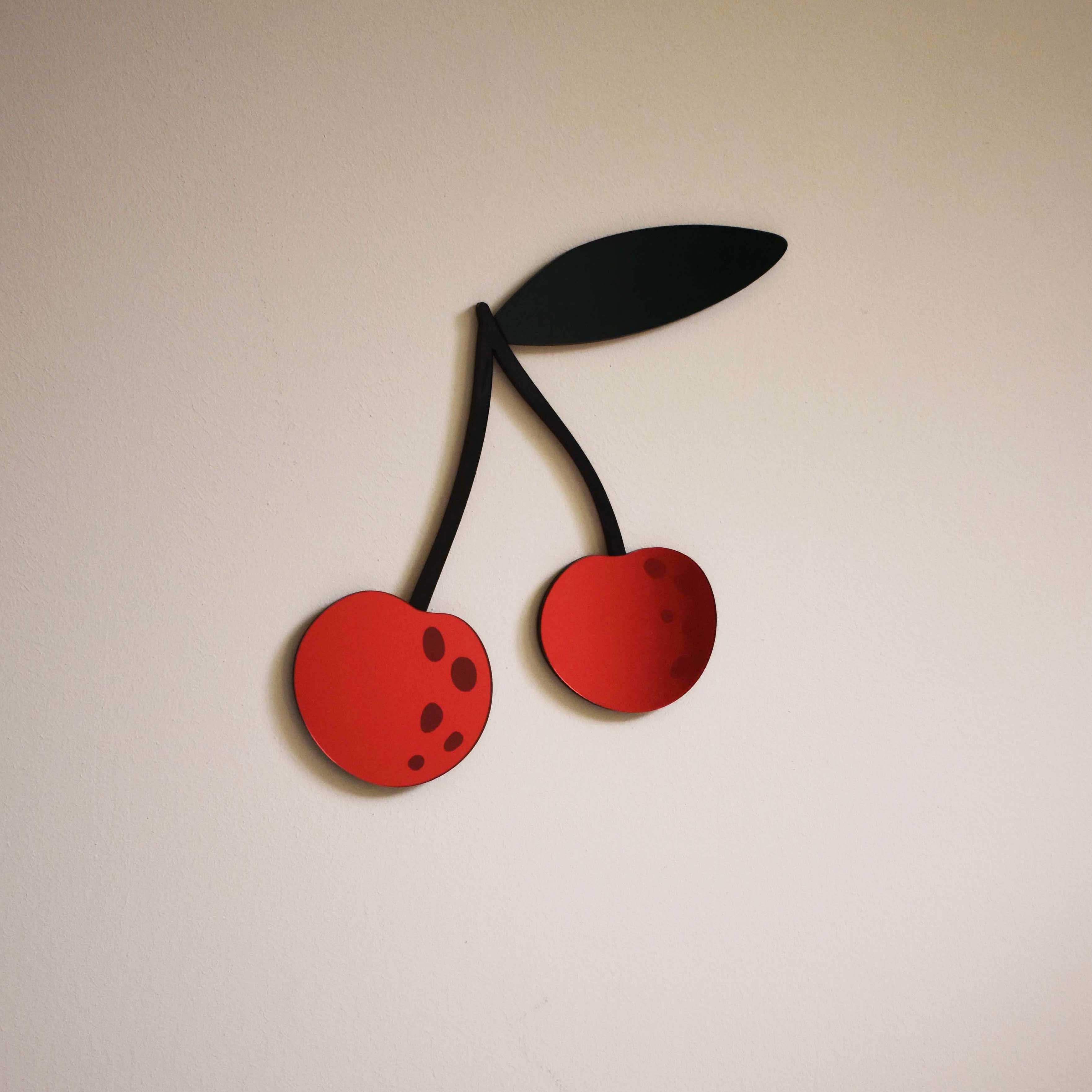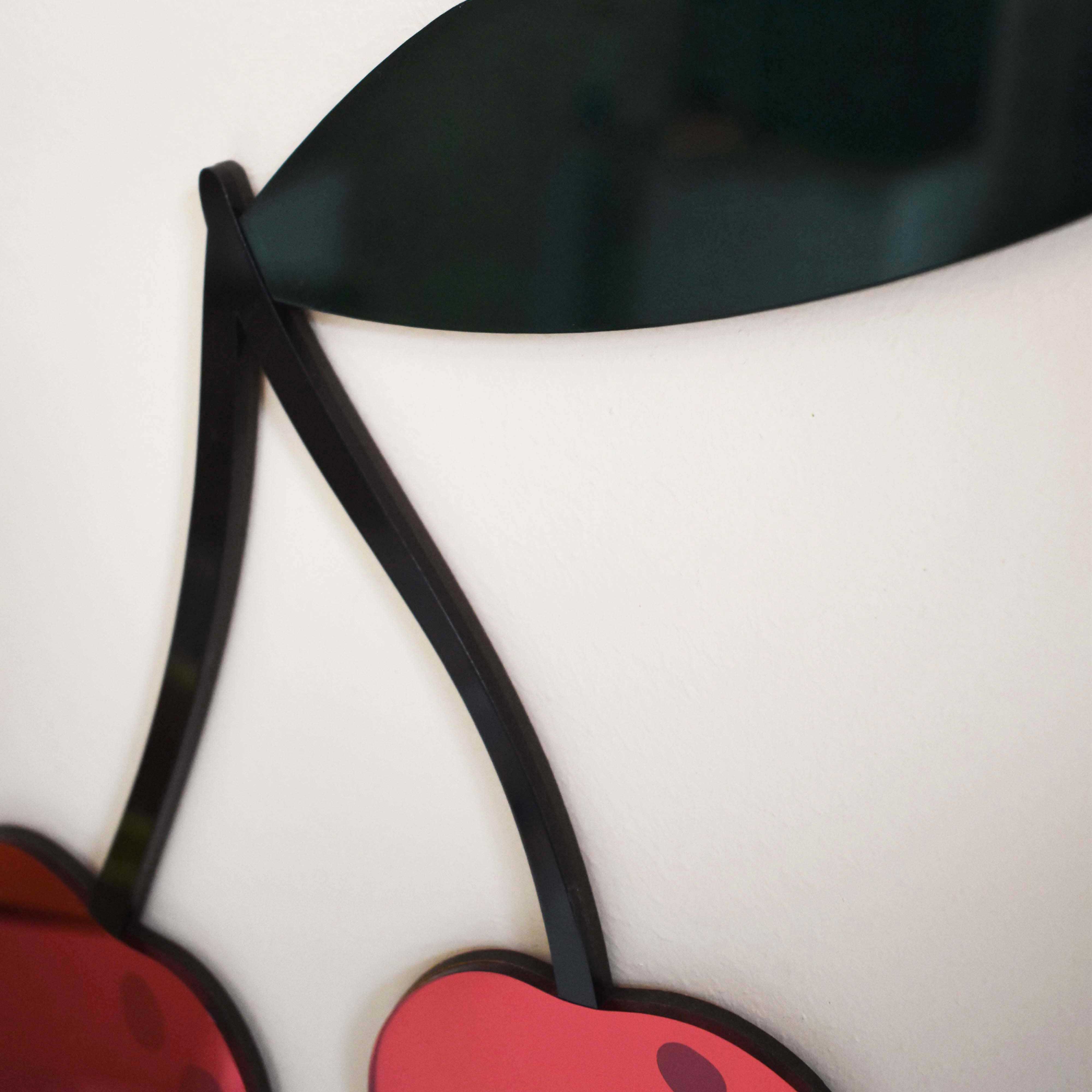 Les cerises sont réalisées à partir de miroir acrylique rouge, les tiges sont en plexi noir brillant et la feuille, en plexi translucide vert foncé