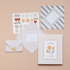 Le set est composé d’une planche de stickers, de 20 feuilles/enveloppes et d’une pochette en papier épais.