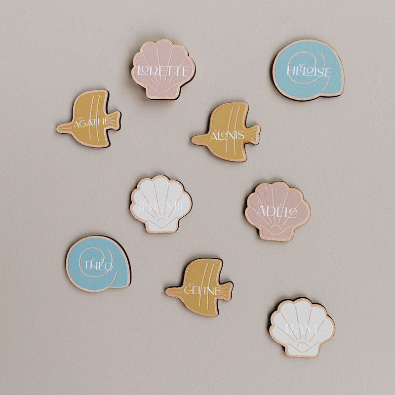 Découvrez les marque-places imprimés coquillages escargots. De jolis marque-places imaginés par Les Mignonneries à personnaliser avec les prénoms de vos petits invités. Fabriqués à partir d'okoumé, ils sont coupés et imprimés dans notre atelier. Vous pourrez faire votre choix parmi 5 couleurs.