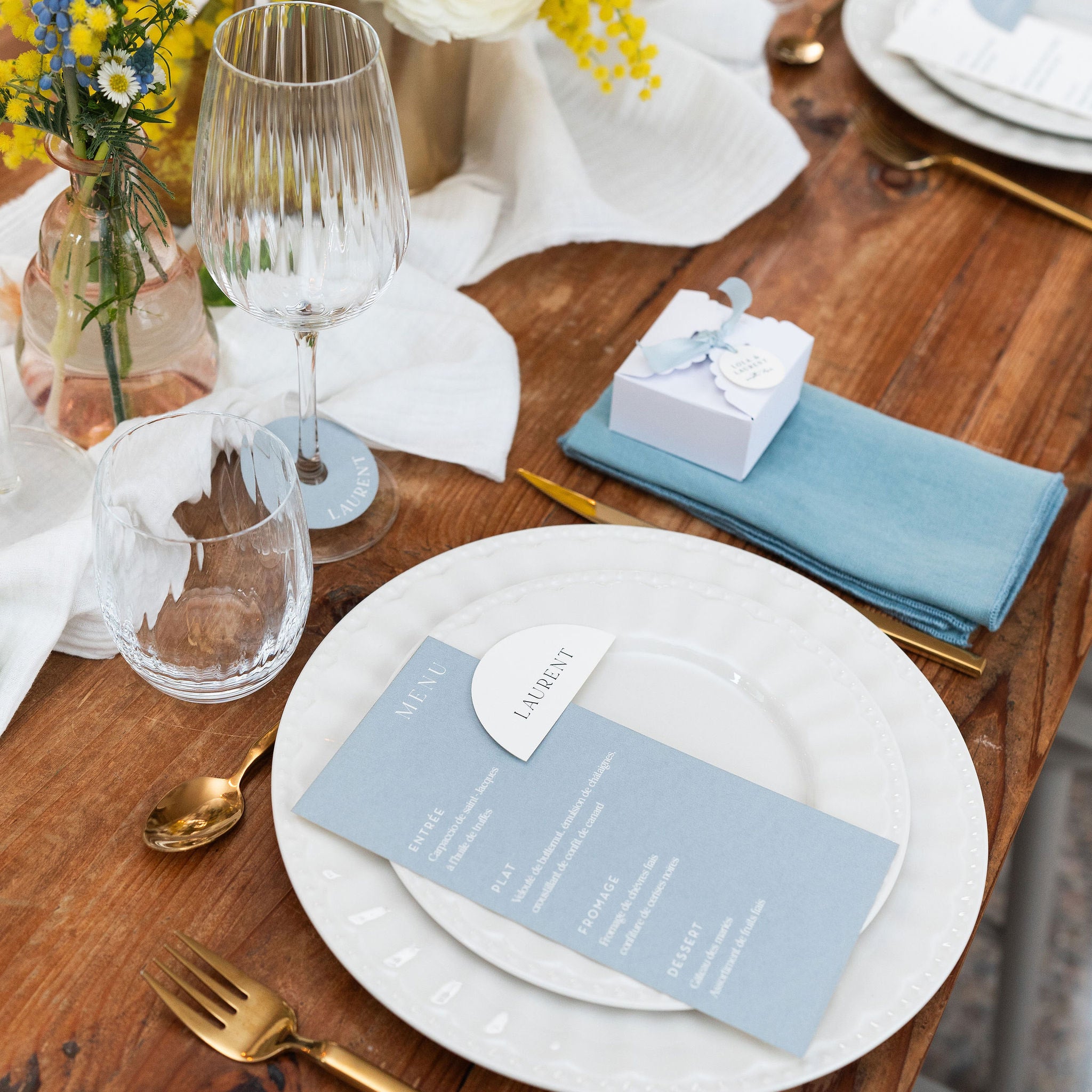 Ces marque-places font partie de notre collection Lola. Ils sont fabriqués en papier texturé 320g/m2. Ils sont coupés et imprimés dans notre atelier.