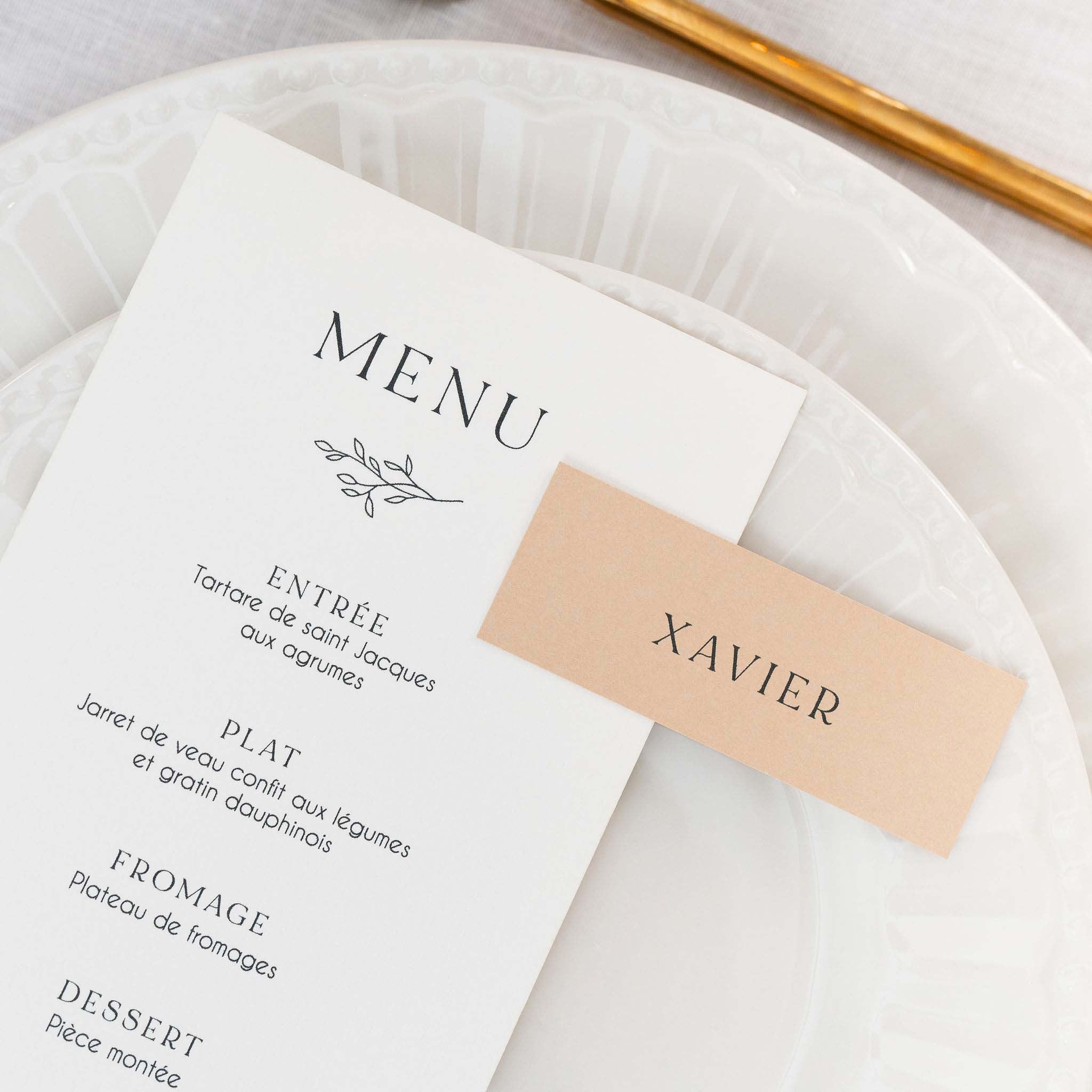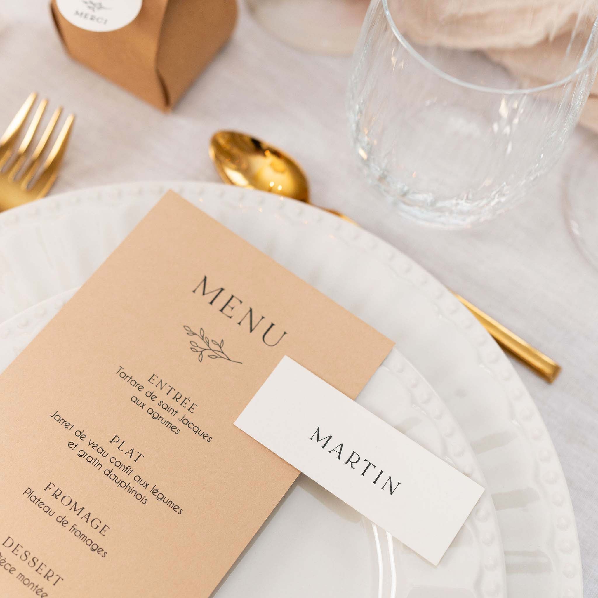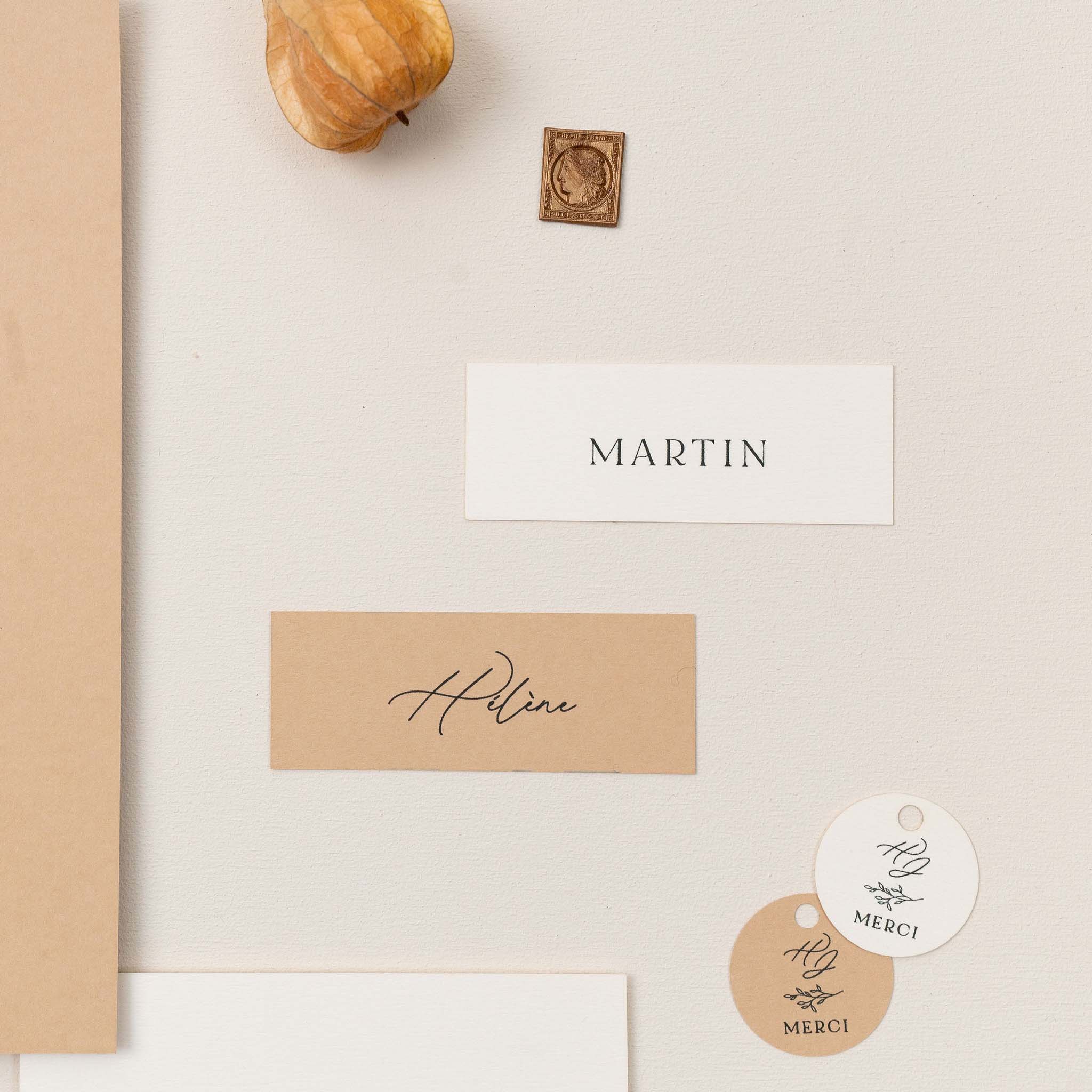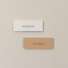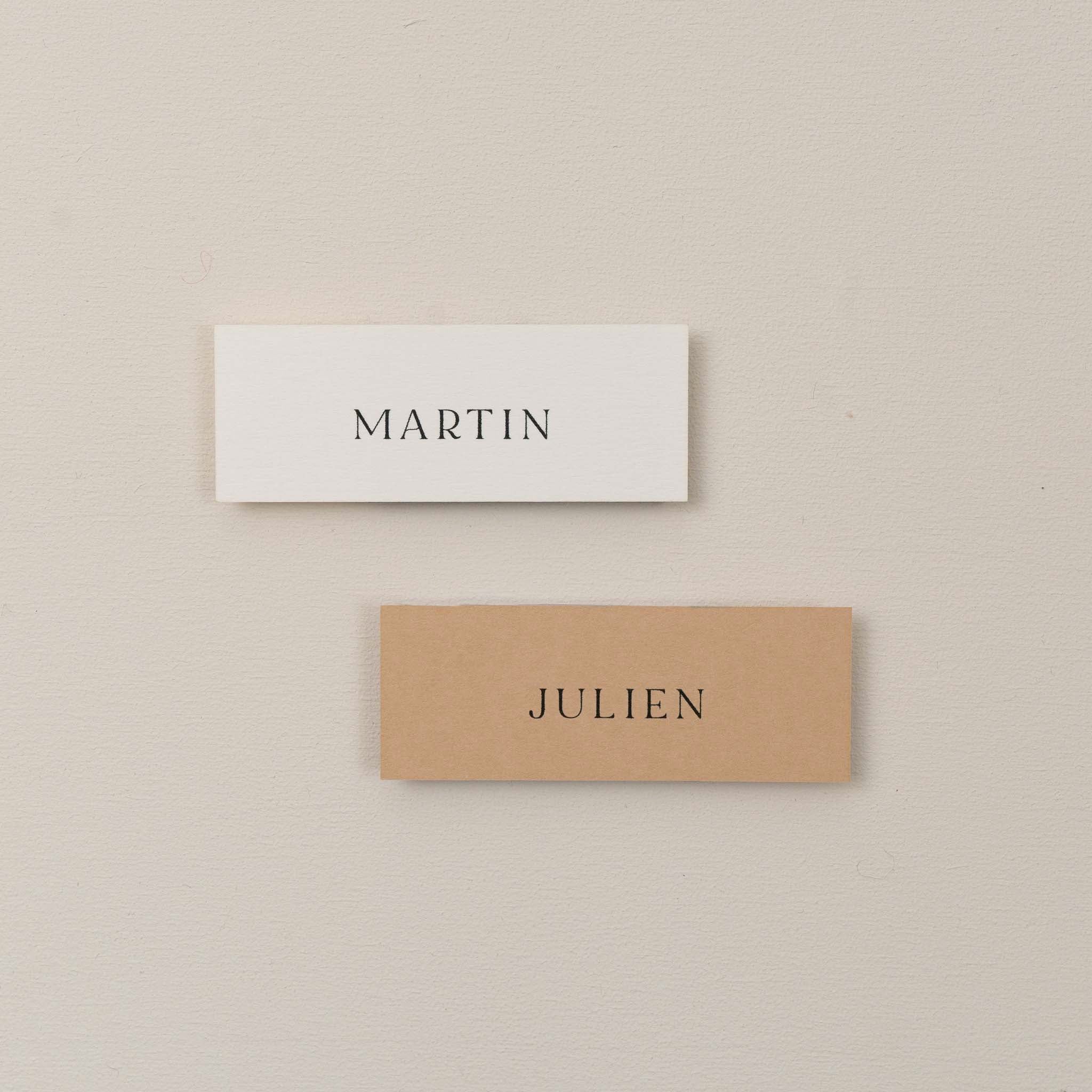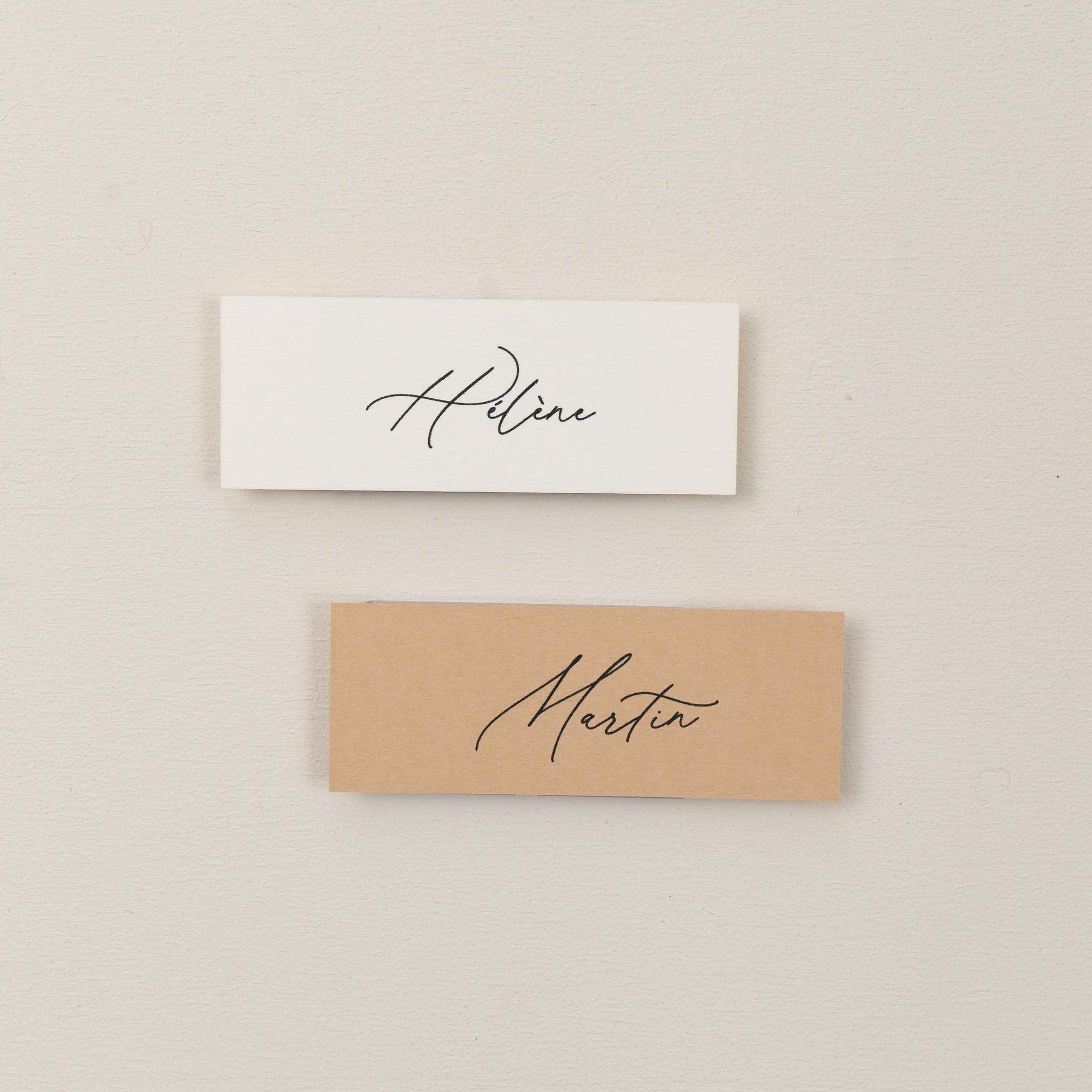 Découvrez les marque-places en papier blanc ou papier brun texturé 350g/m2 imprimés Nomad. De délicats marque-places imaginés par Les Mignonneries à personnaliser avec les prénoms de vos invités.