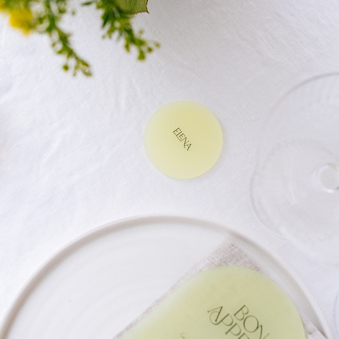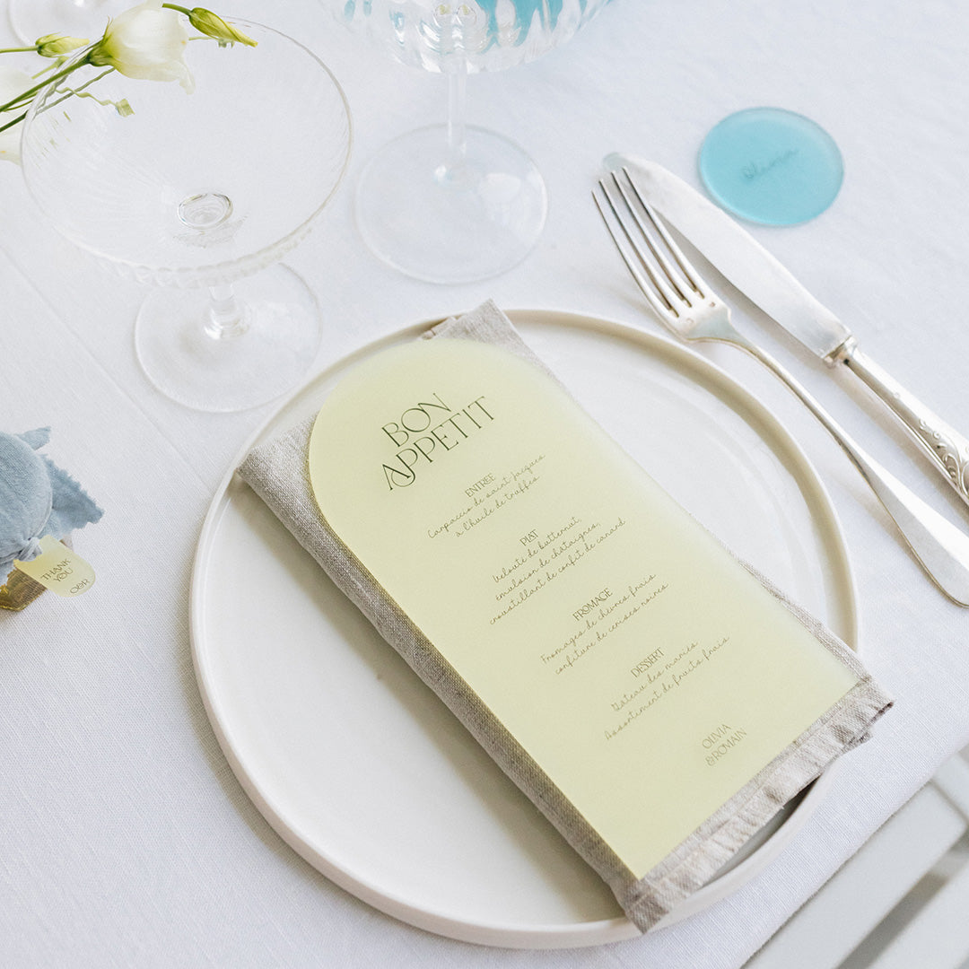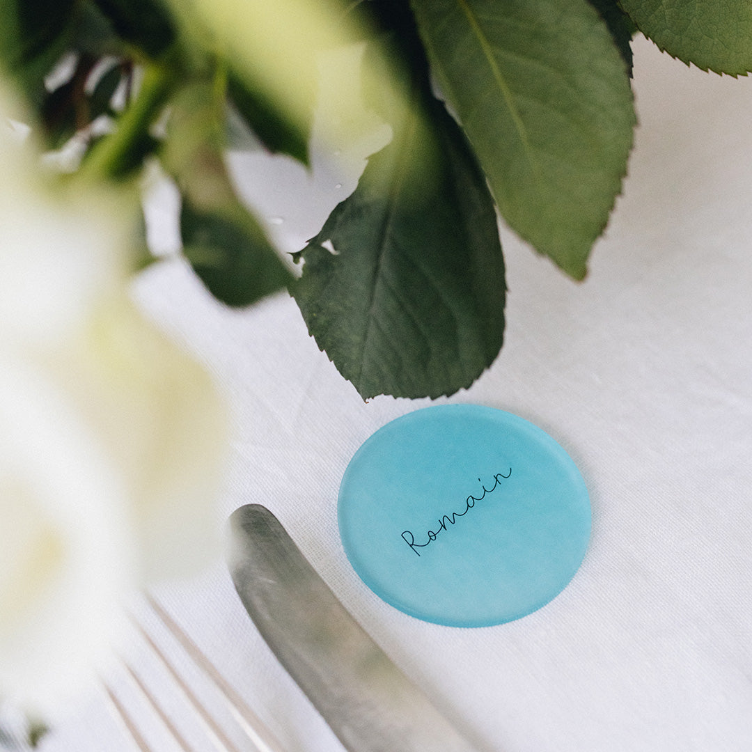 Ces marque-places font partie de notre collection Pastel, une collection tendance et décalé en plexi givré coloré. Ils sont coupés et imprimés dans notre atelier. Vous pourrez choisir la couleur dans les options ci-dessous.