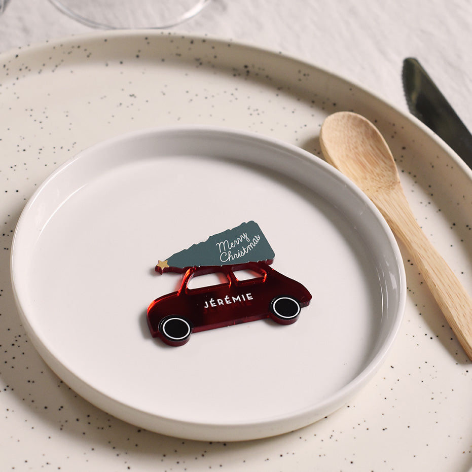 Découvrez les marque-places voiture de Noël. Imaginés par les Mignonneries, et à personnaliser avec les prénoms de vos invités, ils sont entièrement créés dans notre atelier. Profitez d'une création unique disponible dans deux coloris principaux : rose (baby pink) et miroir rouge.