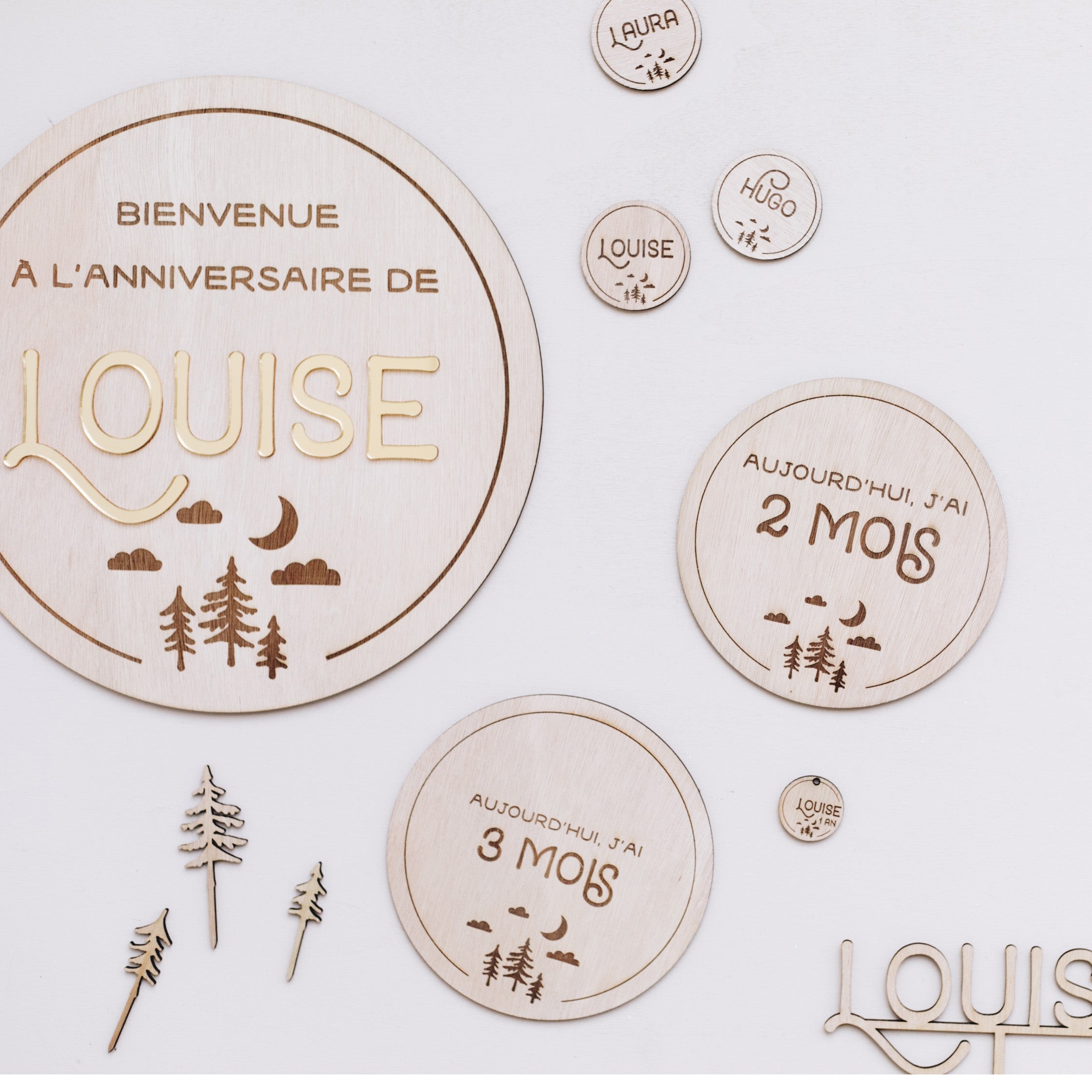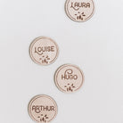 Découvrez les marque-places en bois gravé Forêt. De délicats marque-places imaginés par Les Mignonneries à personnaliser avec les prénoms de vos invités.