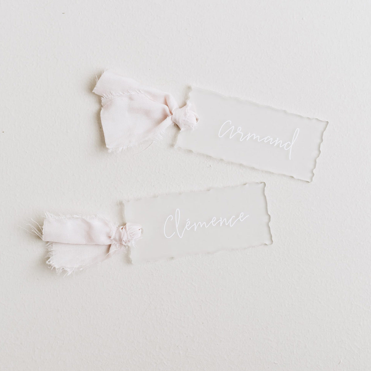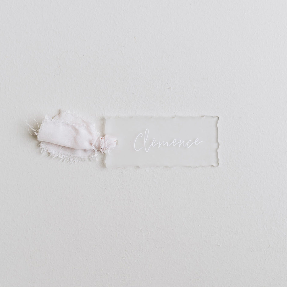Découvrez les marque-places en plexi givré blanc Frost. De délicats marque-places imaginés par Les Mignonneries à personnaliser avec les prénoms de vos invités. Ils sont coupés et gravés dans notre atelier.