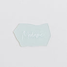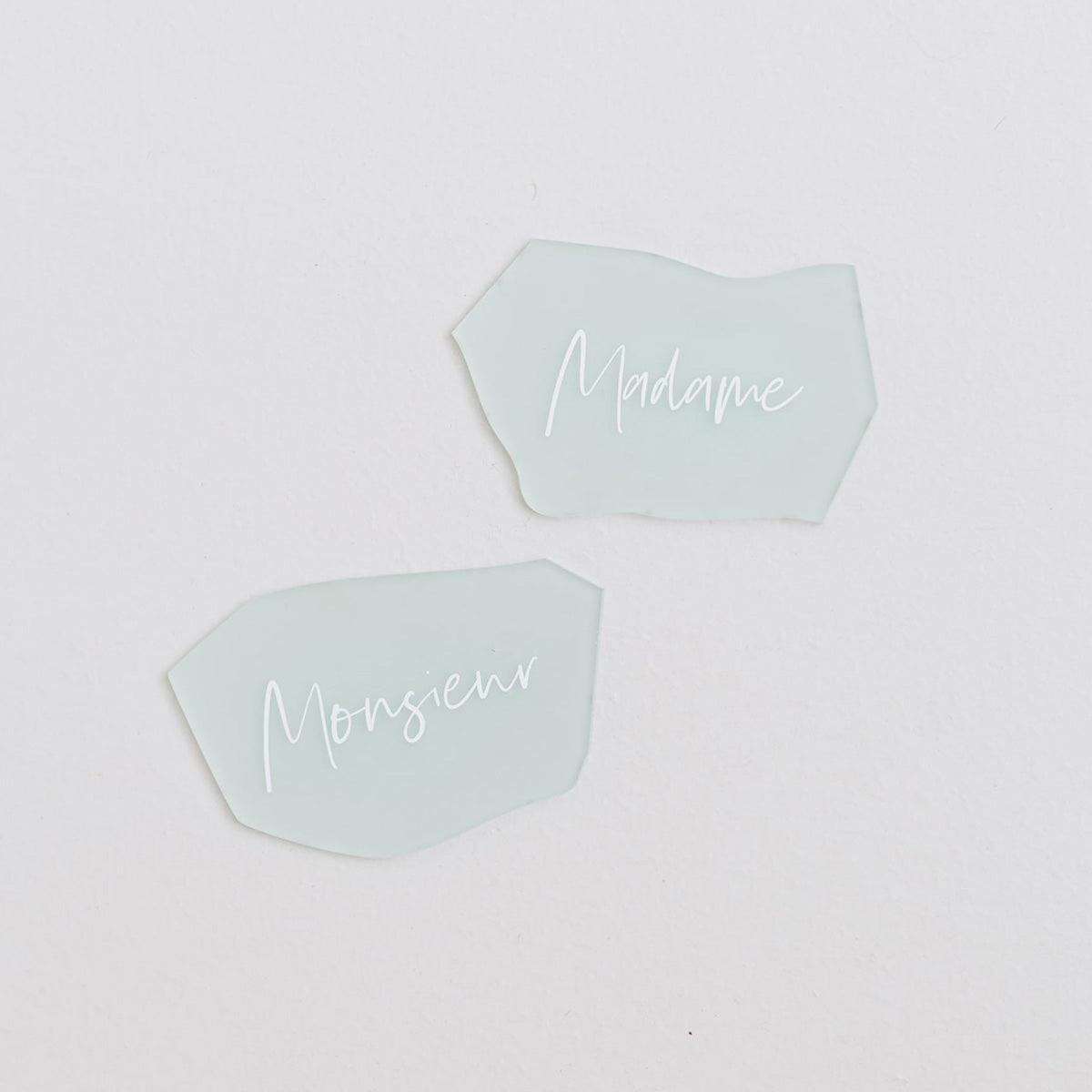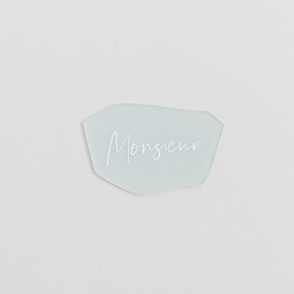 Découvrez les marque-places en plexi givré vert Pure. De délicats marque-places de forme aléatoire, et texte blanc, imaginés par Les Mignonneries à personnaliser avec les prénoms de vos invités.