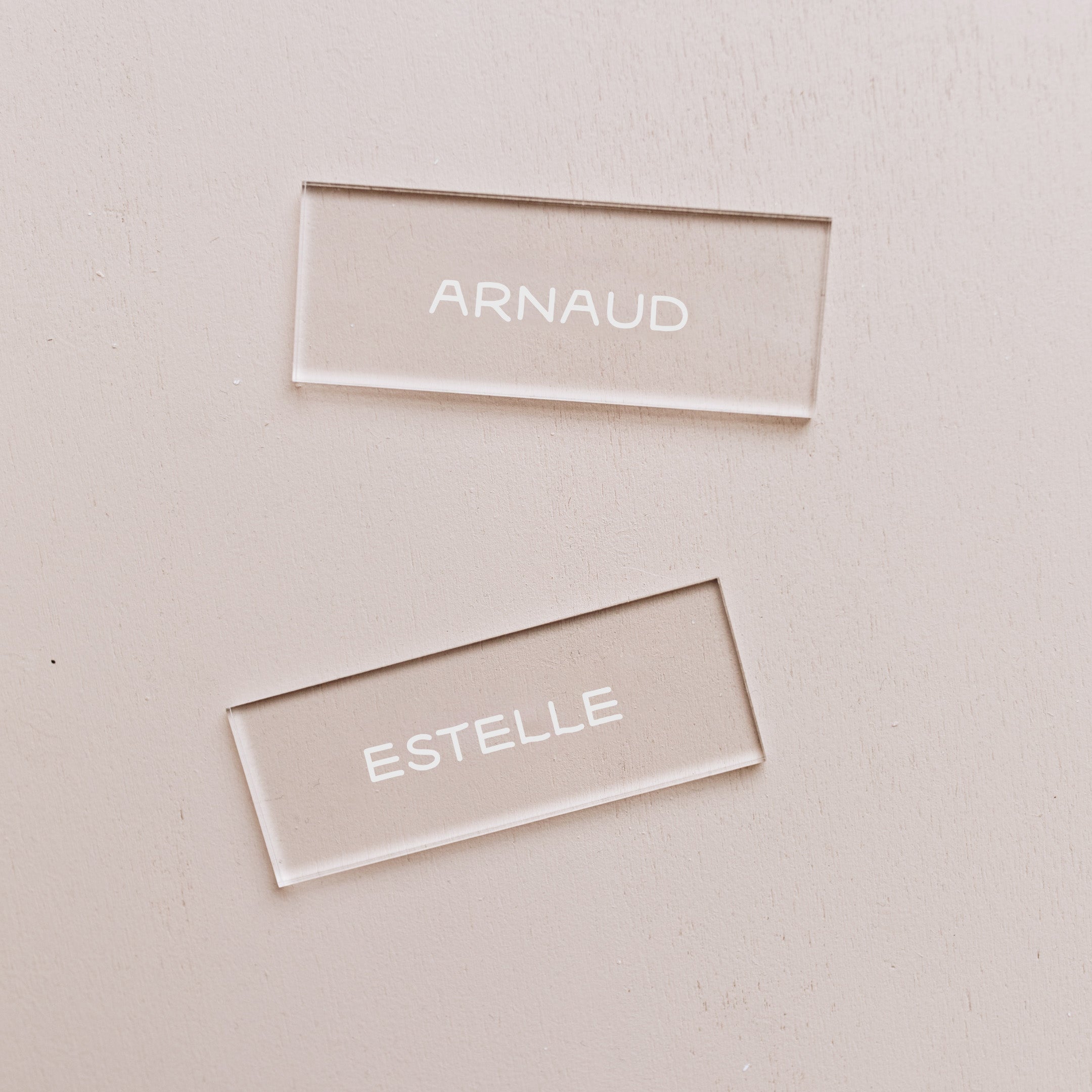 Découvrez les marque-places en plexi transparent Sailor. De délicats marque-places gravés, imaginés par Les Mignonneries à personnaliser avec les prénoms de vos invités.